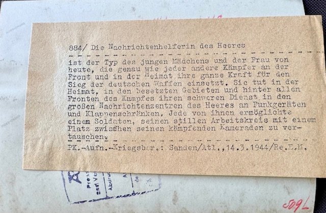 Female Army Signals Assistant , period press photo, 5" X 7". Reads "The army's intelligence worker is the type of the young girl and the woman of today who, like any other combatant at the front and at home, devotes all her strength to the victory of German weapons. She does her hard work at home, in the occupied territories and behind all fronts of battle in the army's great intelligence centers, with radios and file cabinets. Each of them enabled a soldier to exchange his silent work for a place between his comrades in battle."