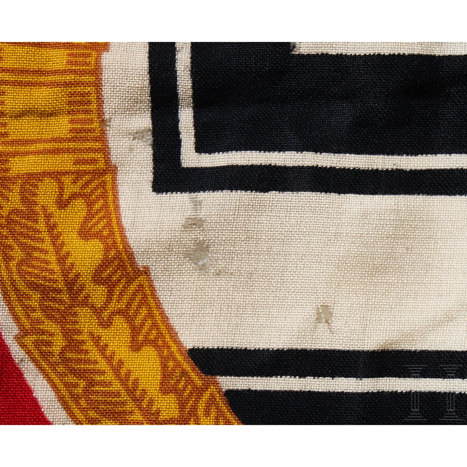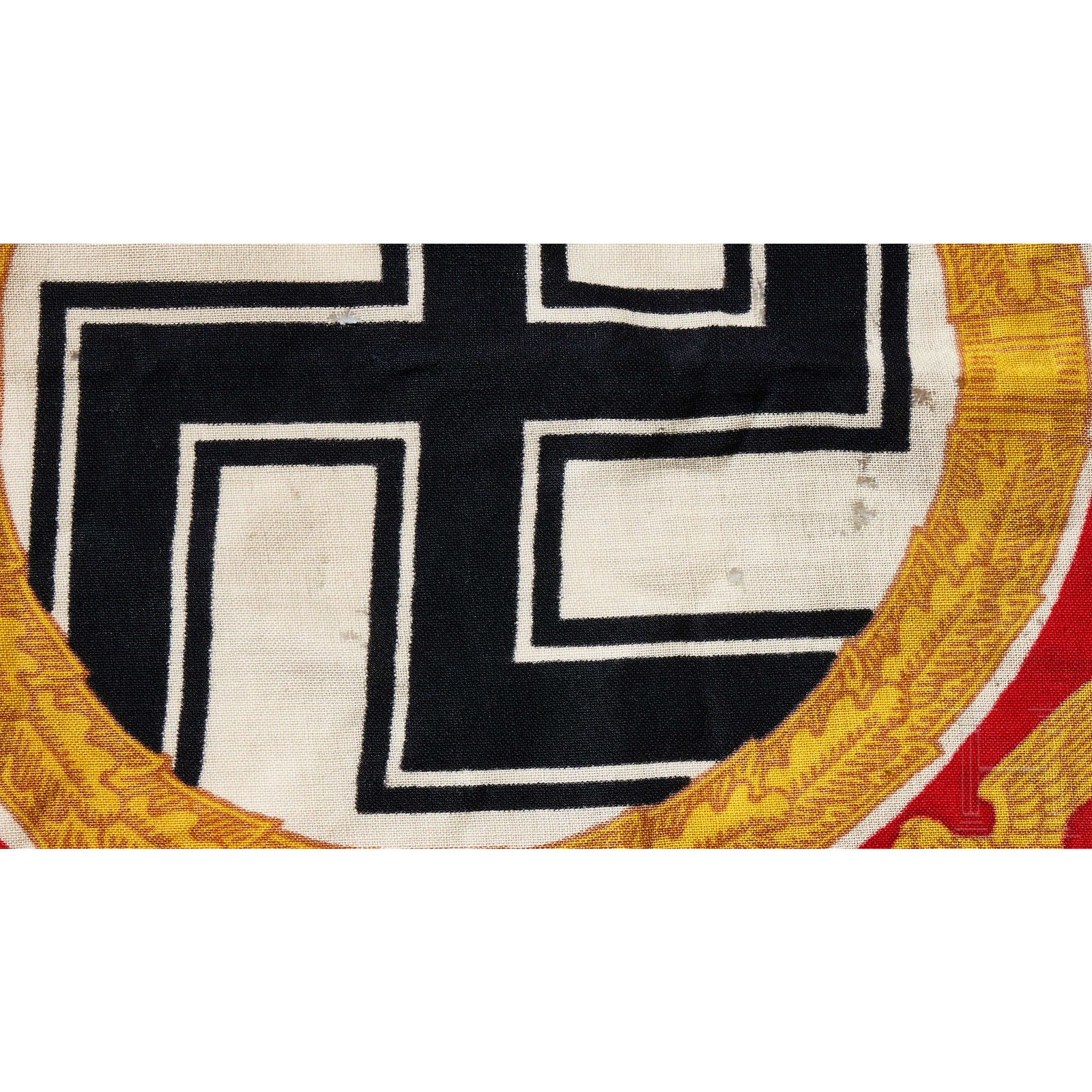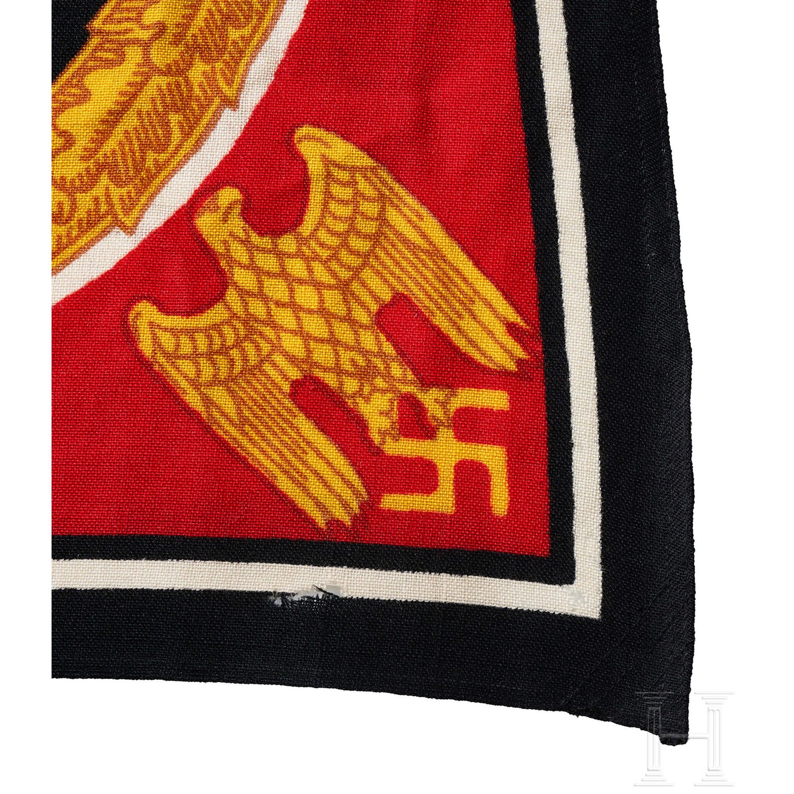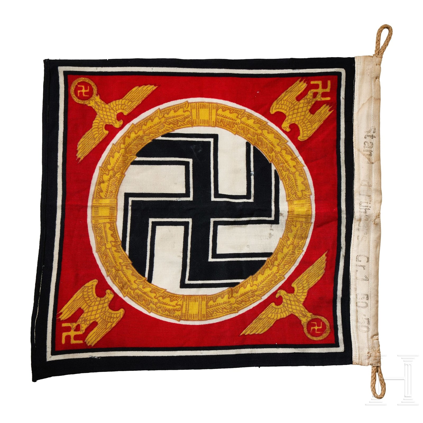 A Führer and Reich Chancellor’s Standard. Dual sided, woven linen standard with a printed image. Red base field with black/white/black outer border trim. Centered on the red field is a white circular field with a black static swastika with a white and black striped outer border, encompassed by a golden yellow circular oak leaf wreath with tan accents. Each corner of red field has a golden yellow eagle with the Wehrmacht styled eagle with down swept wings to the upper right and lower left corners and a political style national eagle outstretched wings to the opposite two corners.Image is identical to both sides. White bunting hoist edge has a tunnel looped suspension rope with stitched attachment loops to both the top and bottom corners. Hoist edge bunting is well marked with black ink stamped designation abbreviation that appears to be “Stand. d.Führers Gr.1”, and dimensions in centimeters,“50 x 50”. White bunting hoist edge also has a white rayon tag with blue machine woven manufacturer's name and location, “Wurttembergische Cattunmanufactur Heidenheima. Brz.”. The standard is in overall very good condition with some small minor holes and minor age and usage toning. Scarce!