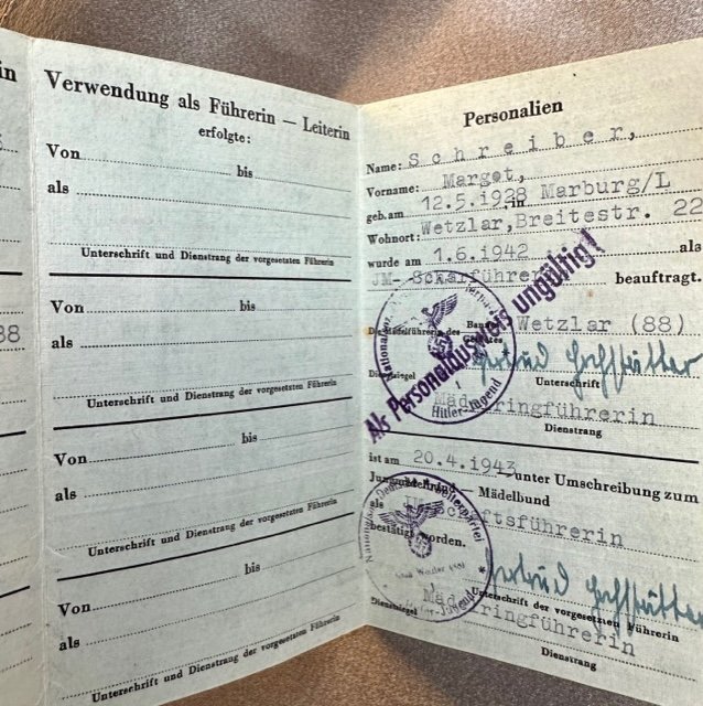 Führerausweis des Bundes Deutscher Mädel in der Hitler-Jugend for Margot Schreiber marked Als Personalausweis ungültig (invalid as an ID card)
