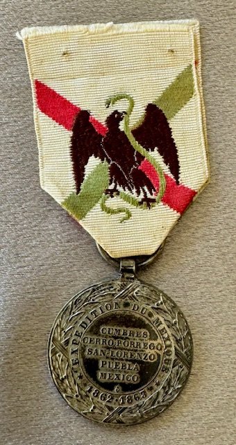The Mexico Expedition Medal was created by the decree of August 29, 1863 and was awarded to all those who participated in the Expedition from 1862-1863. An estimated 90000 Medals were produced by the Monnaie de Paris. The obverse bearing the profile of Emperor Napoleon III surrounded by the relief inscription “NAPOLEON III EMPEREUR”, all within a laurel wreath, the reverse bearing the inscription CUMBRES CERRO-BORREGO SAN LORENZO PUEBLA MEXICO surrounded by the relief inscription EXPEDITION DU MEXIQUE 1862-3, hallmarked with an eagle's head on the reverse, 30.5 mm in diameter, on the original ribbon with an embroidered design bearing the Mexican eagle with snake.
