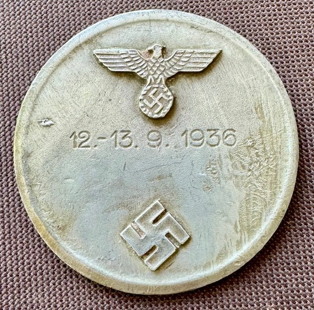 "Freien Stadt Danzig fur Besondere Kulturelle Leistungen" to front. NSDAP eagle to reverse, dated "12.-13. 9. 1936". Medal for special service. 60mm, zinc based metal.