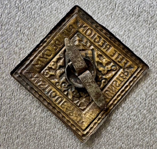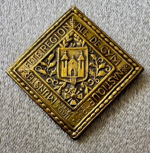 "Fete Region Ale de Gym nastique aout 1924 aut Rhin Munster" (Regional Gymnastics Festival August 1924 in the Rhine, Munster), metal 2 prongs, 24mm x 24mm