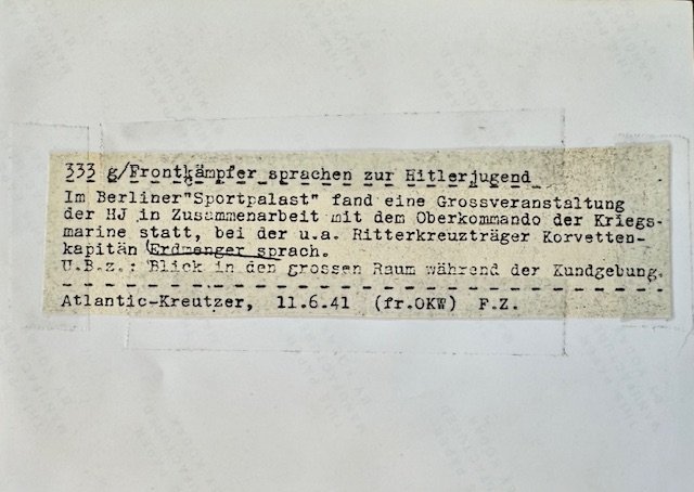 Front fighters speak to the Hitler Youth with Axmann in attendance. Press photo, approx. 7" X 5" in size.