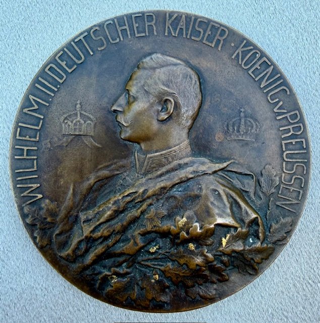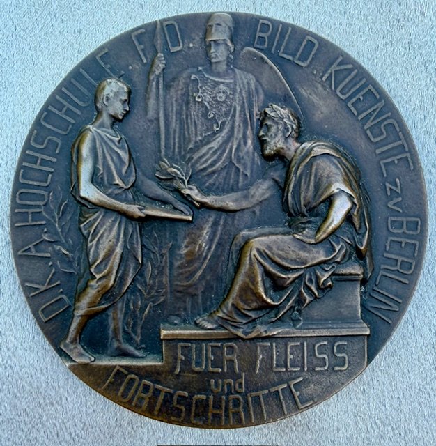 Fulda University of Applied Sciences Table Plaque. One side is inscribed D.K.A. Hochschule FD. Bild Kuenste zv Berlin Fuer Fleiss und Fortschritte (Fulda University of Applied Sciences and Fine Arts Berlin. For Diligence and Progress) with Roman scholars. The other side shows Kaiser Wilhelm II and is inscribed "Wilhelm II Deutscher Kaiser Köenig v Preussen" (Wilhelm II German Emperor King of Prussia). With original case, approx. 90mm, 360 grams. bronze metal, rare !