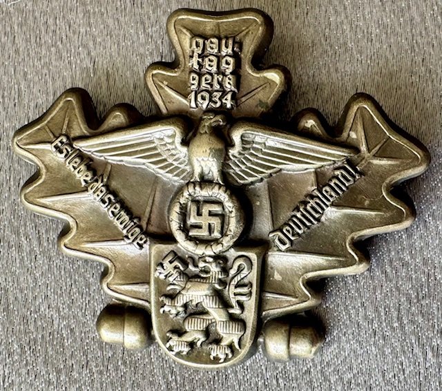 "Gau Tag Gera 1934 Es Lebe das ewige Deutschland!”. The hollow back reverse is maker marked: “Wernstein Jena”, metal pinback, 50mmx42mm