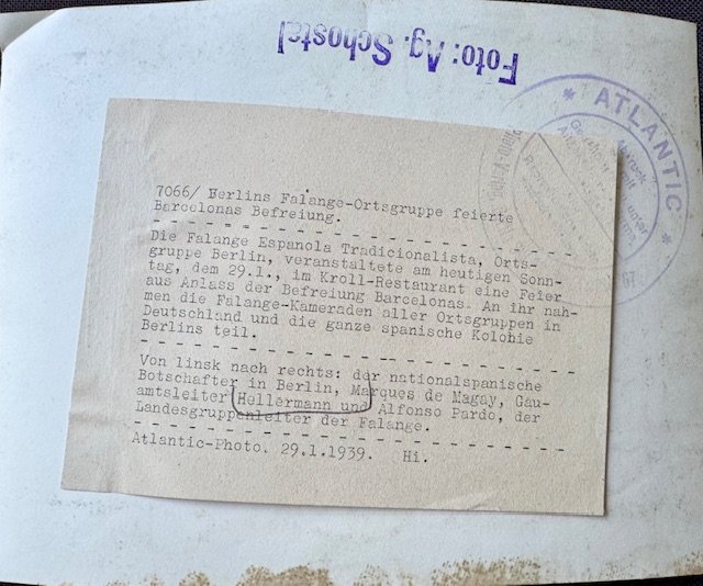 Gauamtsleiter Hellermann with Spanish Diplomats Marques de Magay and Alfonso Pardo, period press photo, 9" X 6 1/2"