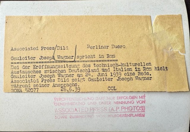 Gauleiter Josef Wagner Speaking in Rome 1939, period photo, 7" X 5"