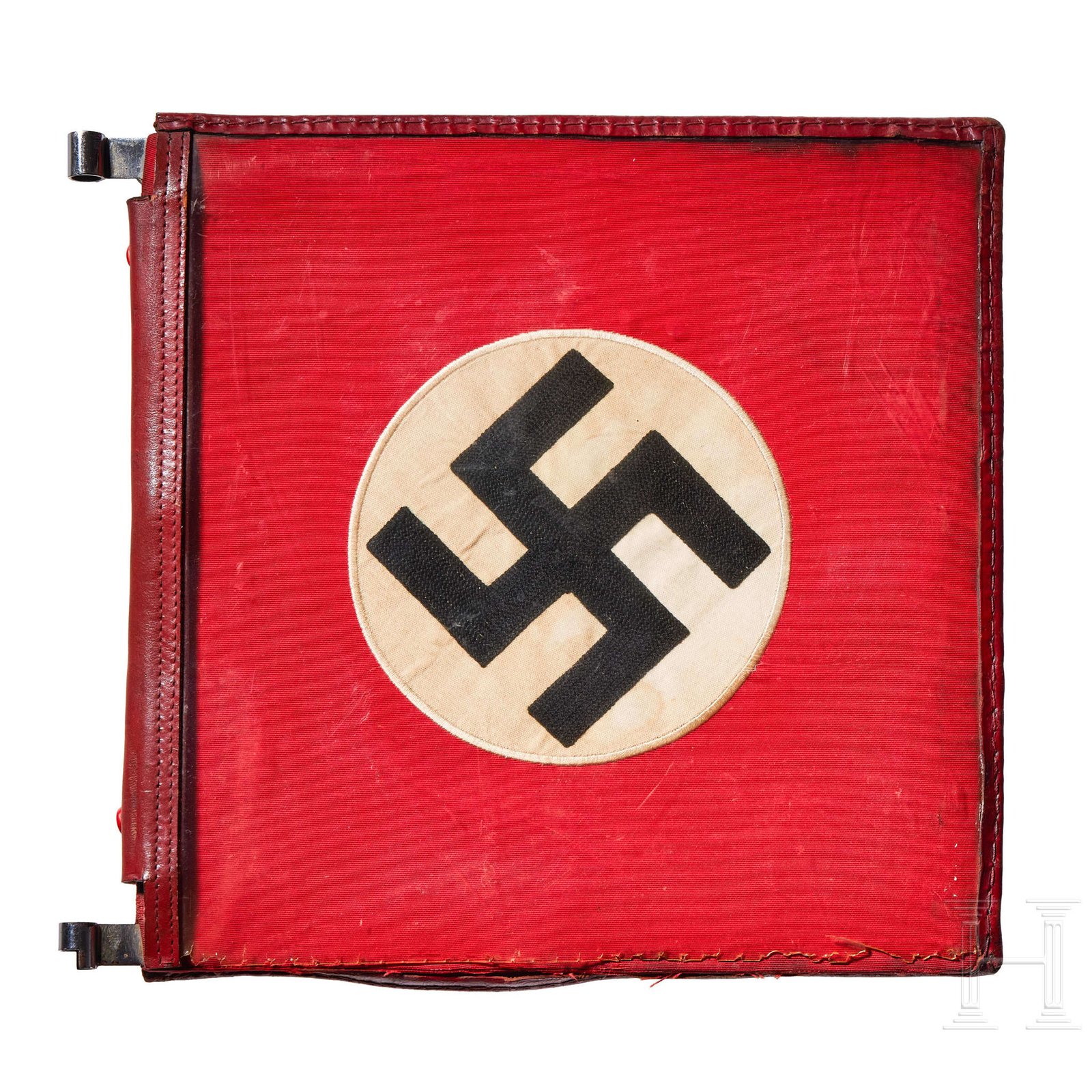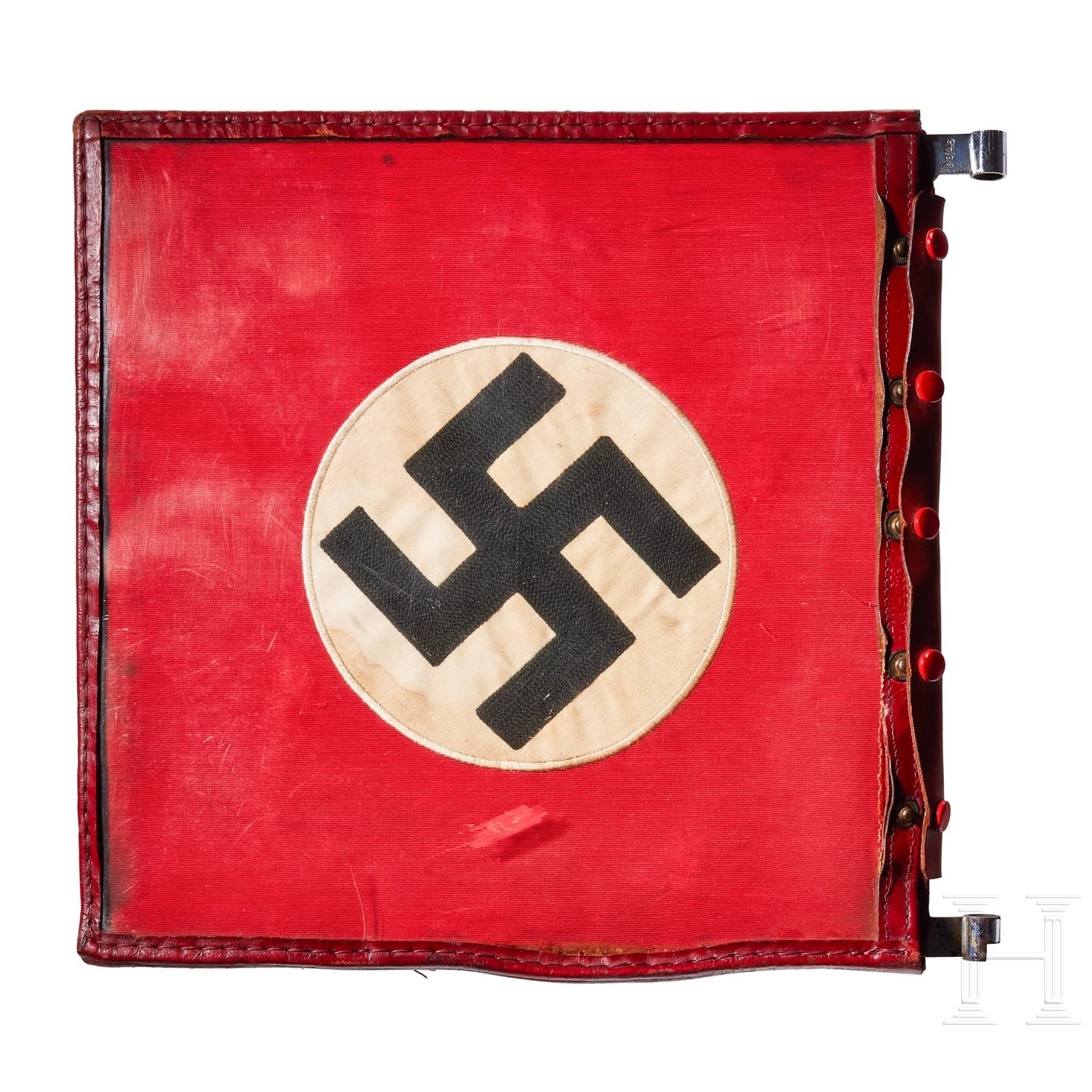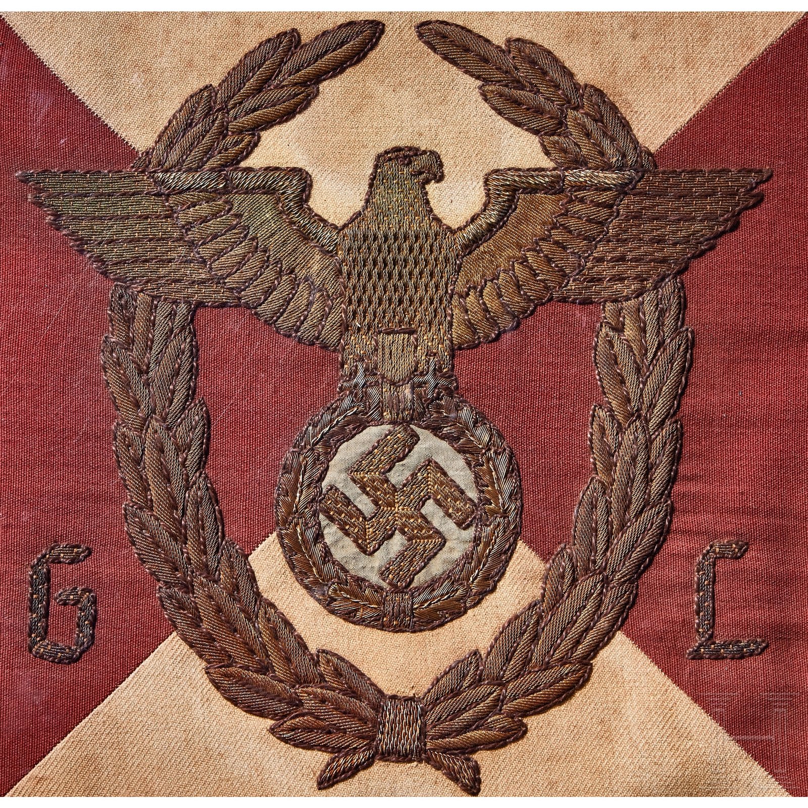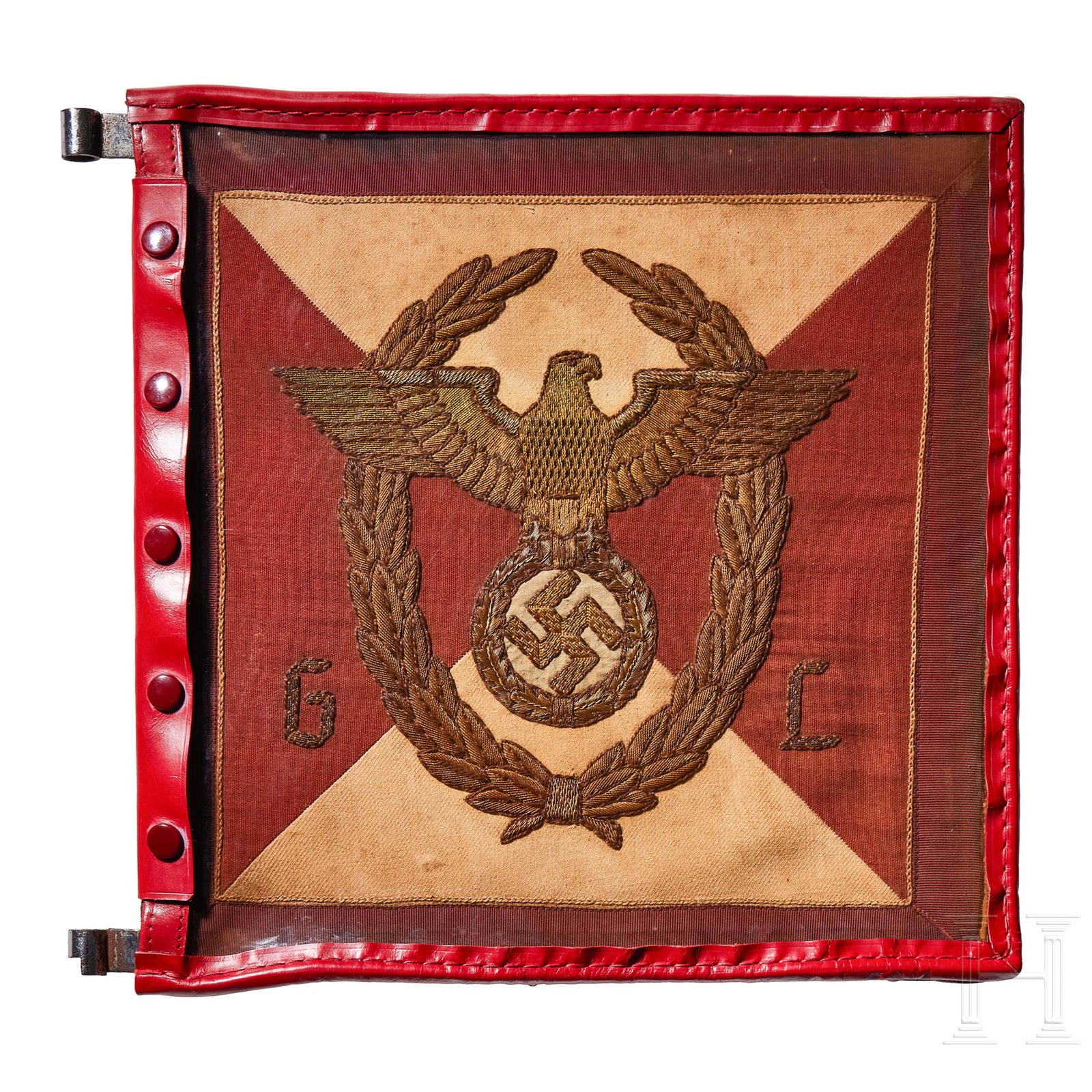Two-sided, multi-piece construction of triangular red and white sections, bordered in dark red. A hand-embroidered gold wire eagle and full wreath flanked by the letters “G“ and “L“. Two-sided red ribbed fabric with chain-stitch embroidered swastika at center. Both on original metal frame with clear foul weather protective cover, trimmed in red leather with five-button snap closure and two nickel-silver sleeves for attachment to pole, marked RZM and “3/45“. Some damage to plastic at bottom edges. Flags have moderate soiling and metal frames have worn through fabric on bottom. Size of each Approx. 30 x 30 cm.