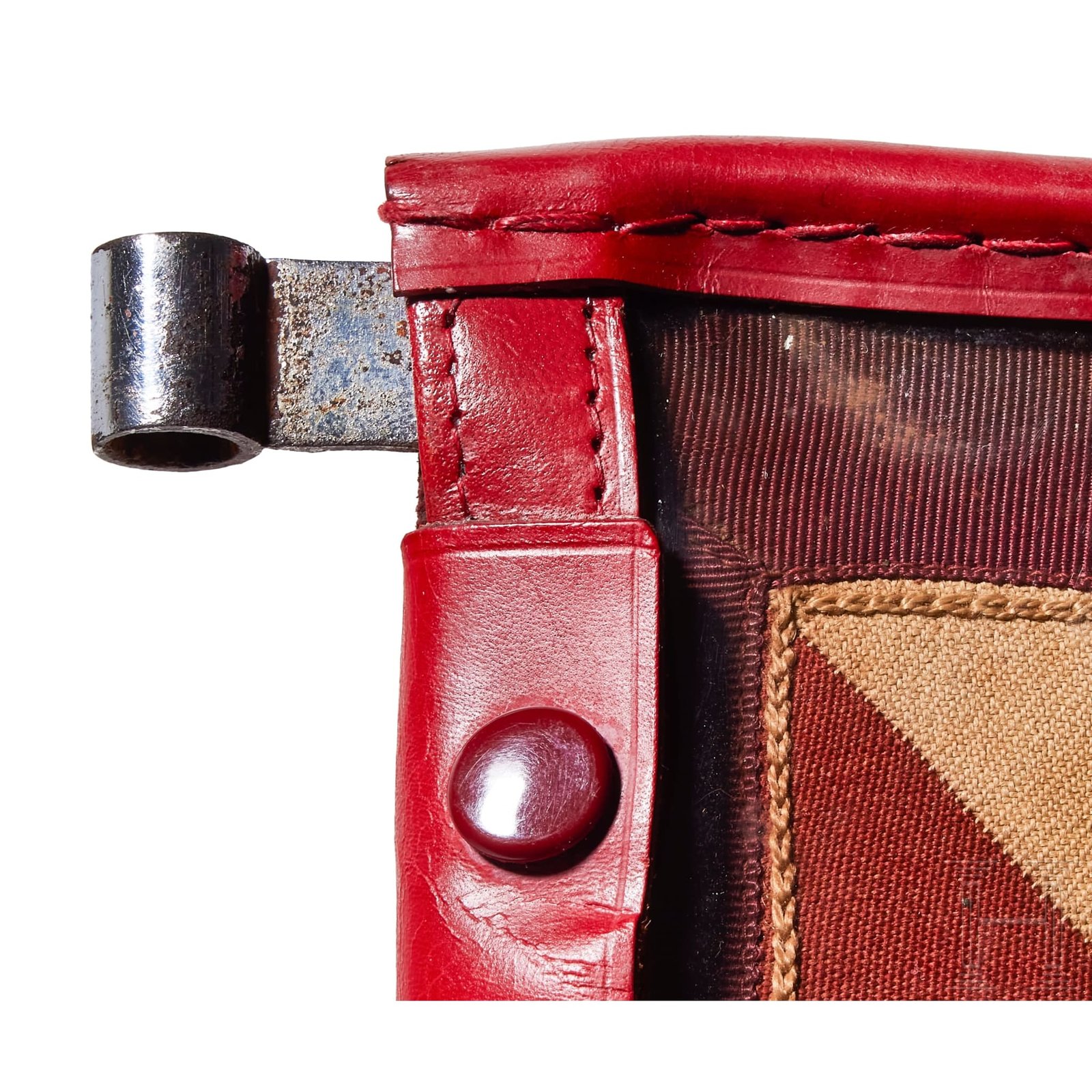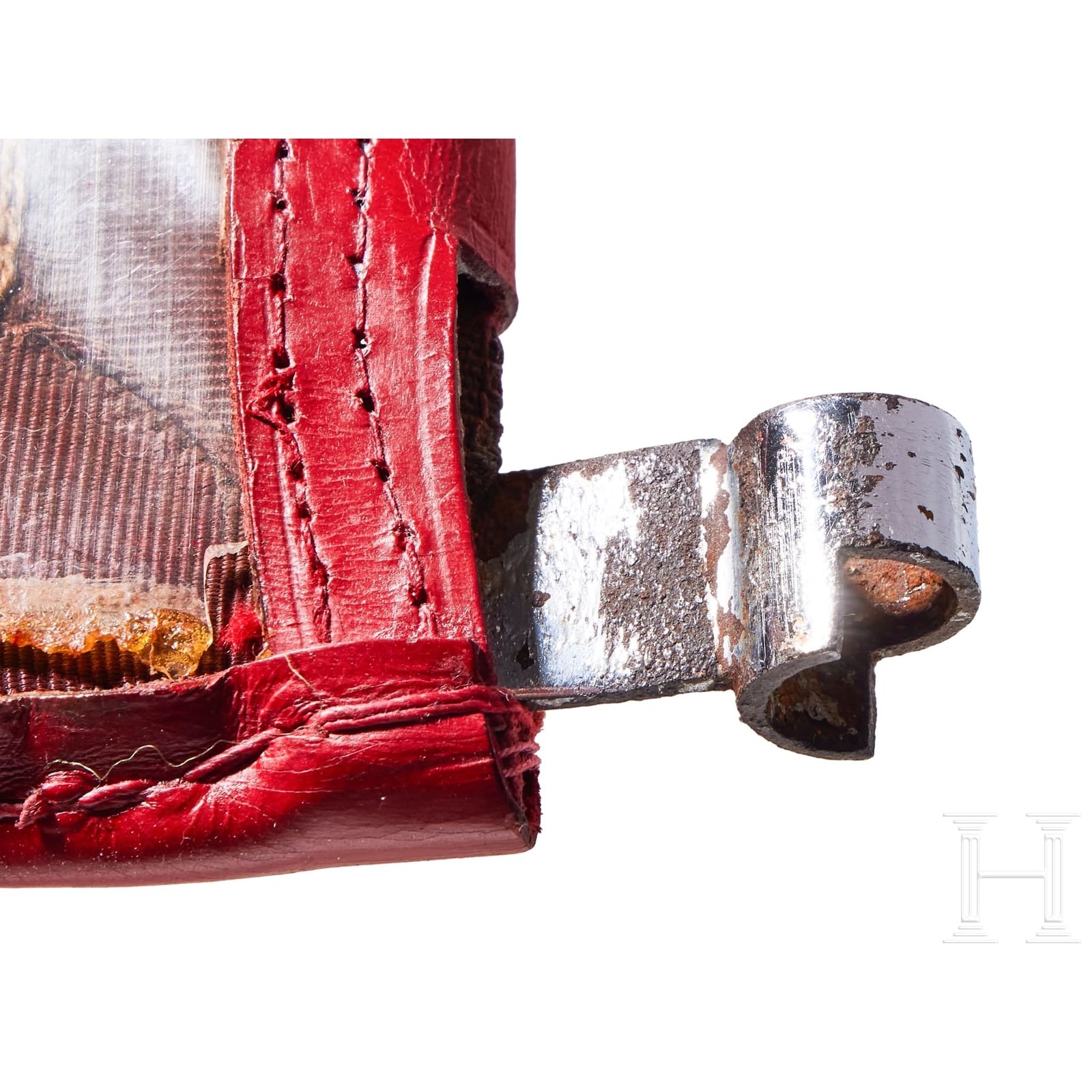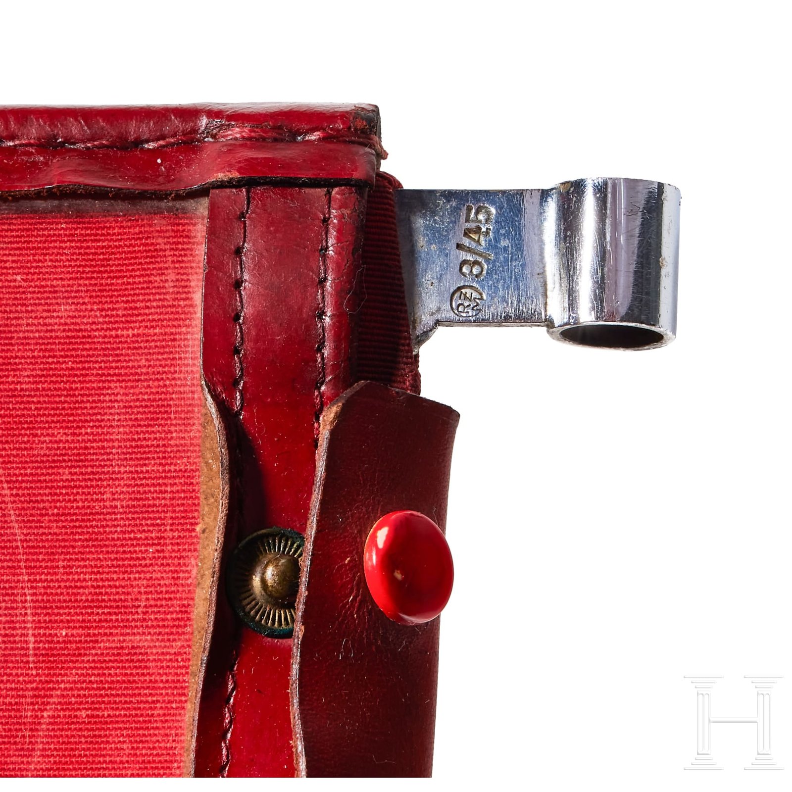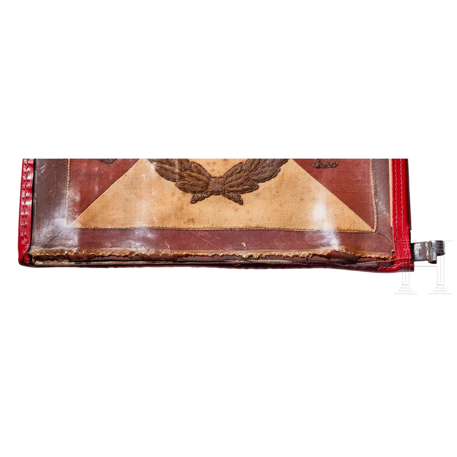 Two-sided, multi-piece construction of triangular red and white sections, bordered in dark red. A hand-embroidered gold wire eagle and full wreath flanked by the letters “G“ and “L“. Two-sided red ribbed fabric with chain-stitch embroidered swastika at center. Both on original metal frame with clear foul weather protective cover, trimmed in red leather with five-button snap closure and two nickel-silver sleeves for attachment to pole, marked RZM and “3/45“. Some damage to plastic at bottom edges. Flags have moderate soiling and metal frames have worn through fabric on bottom. Size of each Approx. 30 x 30 cm.