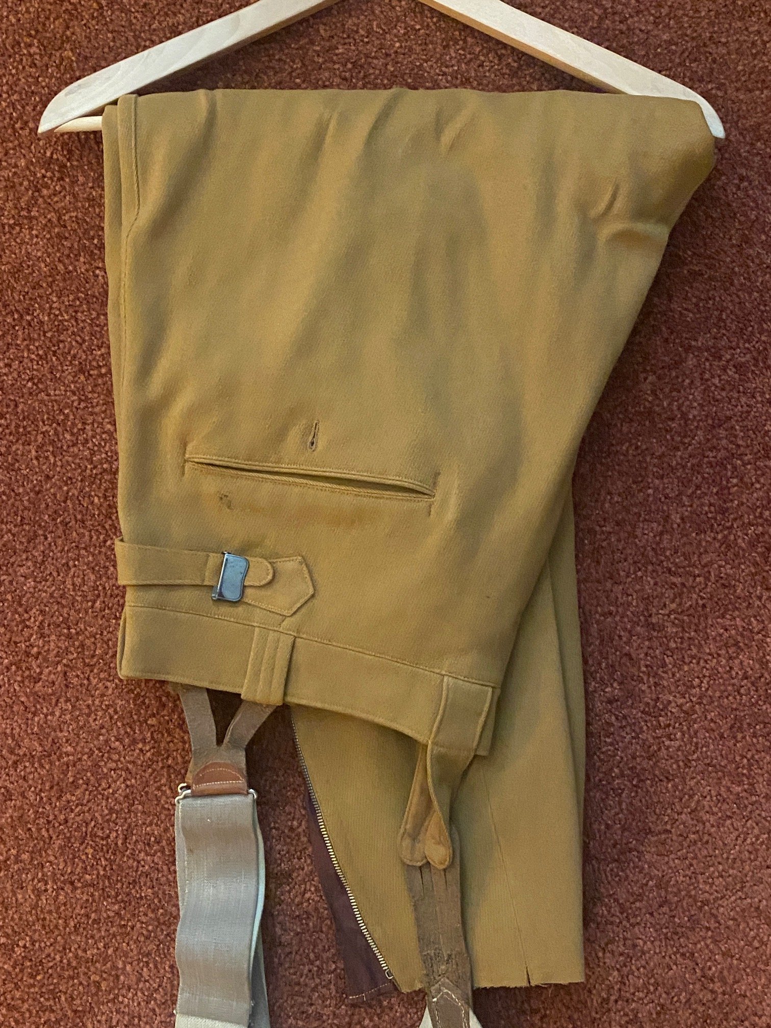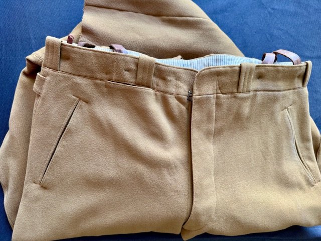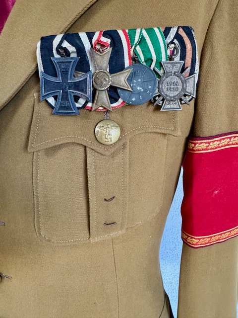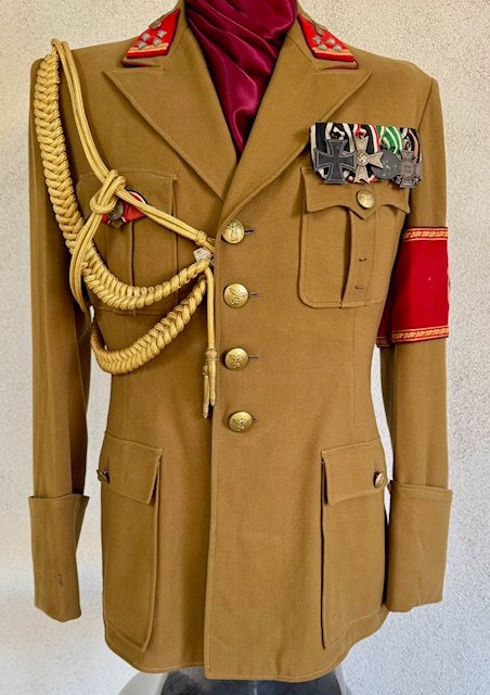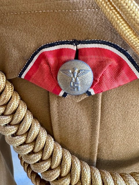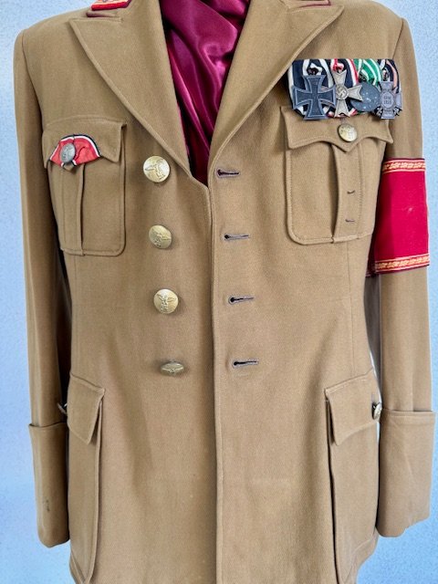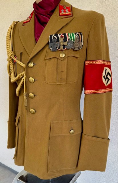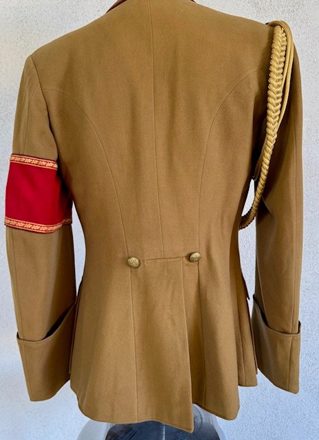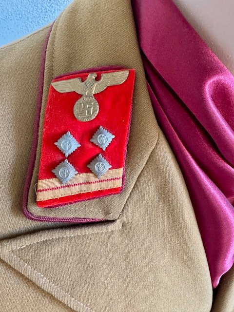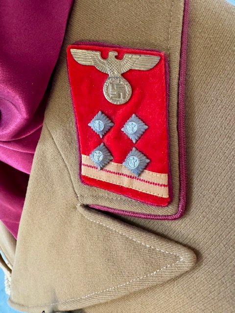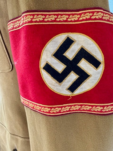 Gauleitung Hauptstellenleiter Tunic. Model 1939 Gauleitung Hauptstellenleiter Tunic with the collar tabs/pay rank of Hauptgemeinschaftsleiter. Armband is a nice BeVo style with cellion oakleaves. Collar tabs in great shape, although the gilt finish gone from the pips. Four buttons to the front are matching, tunic is in excellent condition, showing little to no wear. Breast pocket has loops for one medal and one medal bar. Blood Order ribbon sewn onto pocket. Medal bar came with and is included. Political Leader pants with zipper leg closures and suspenders. Aiguillette not included, sold separately.
