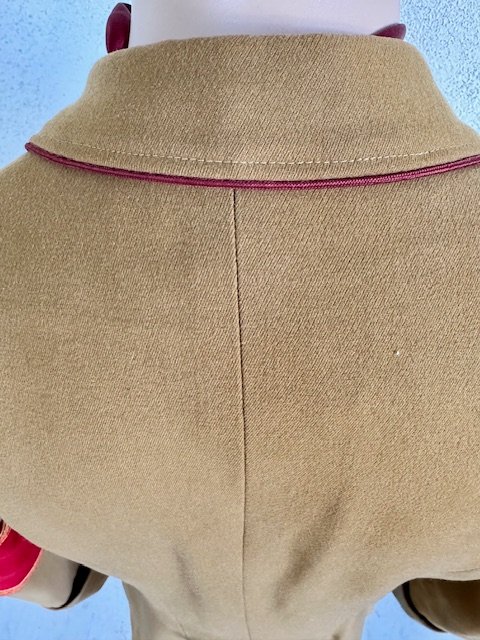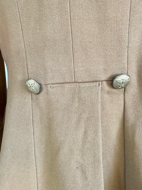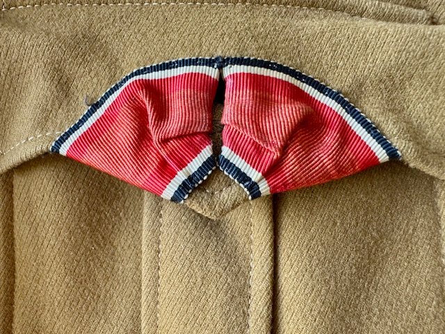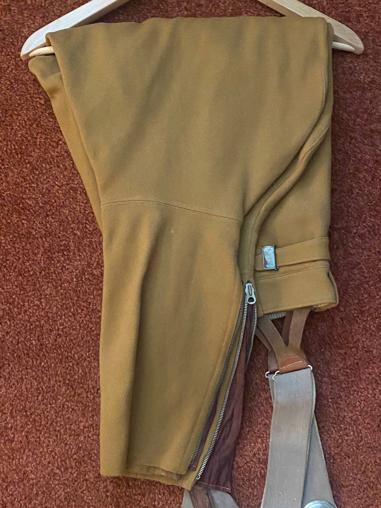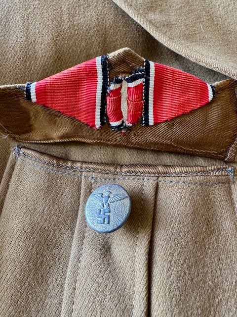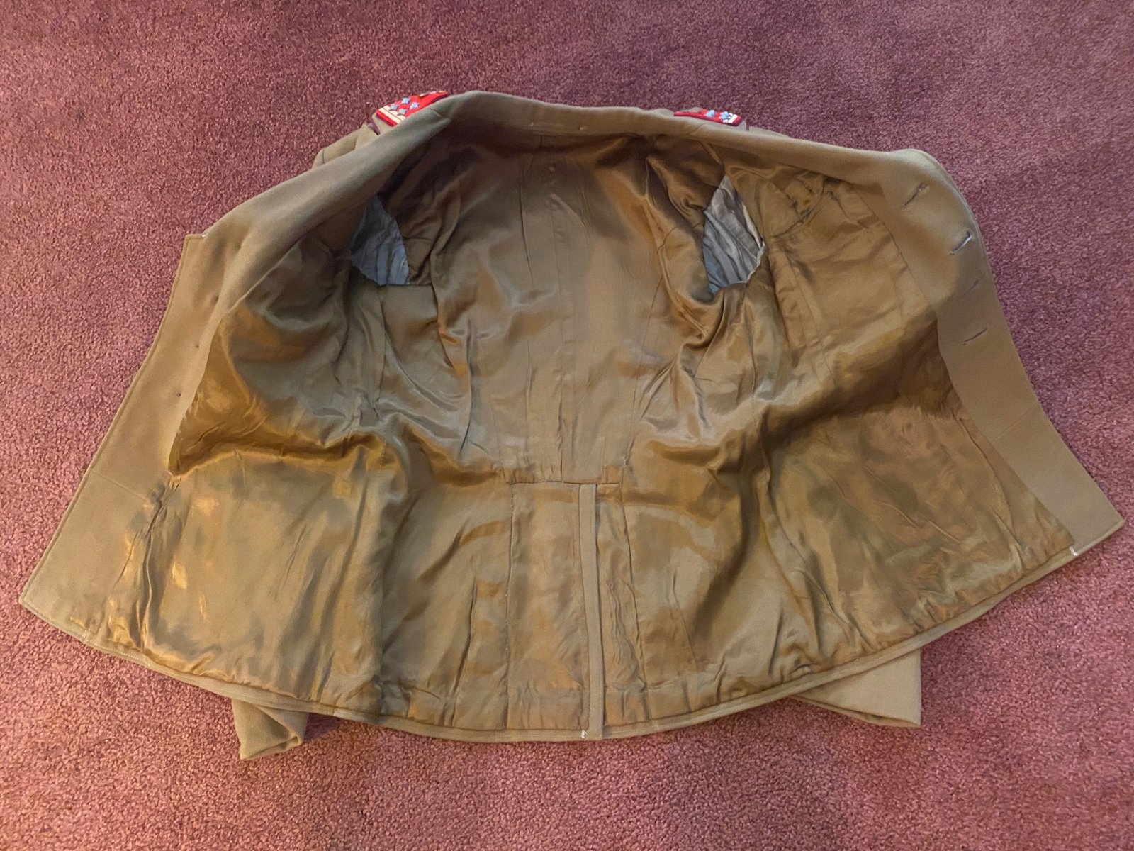 Gauleitung Hauptstellenleiter Tunic. Model 1939 Gauleitung Hauptstellenleiter Tunic with the collar tabs/pay rank of Hauptgemeinschaftsleiter. Armband is a nice BeVo style with cellion oakleaves. Collar tabs in great shape, although the gilt finish gone from the pips. Four buttons to the front are matching, tunic is in excellent condition, showing little to no wear. Breast pocket has loops for one medal and one medal bar. Blood Order ribbon sewn onto pocket. Medal bar came with and is included. Political Leader pants with zipper leg closures and suspenders. Aiguillette not included, sold separately.