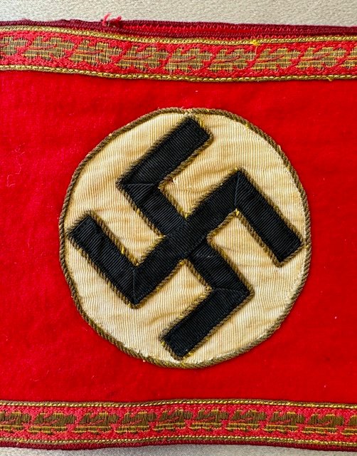 Armband for Gauleitung Leiter einer Hauptstelle. Bullion oakleaf bands with black ribbon swastika surrounded by gold braid. Sewn together, approx. 16" in length, choice condition