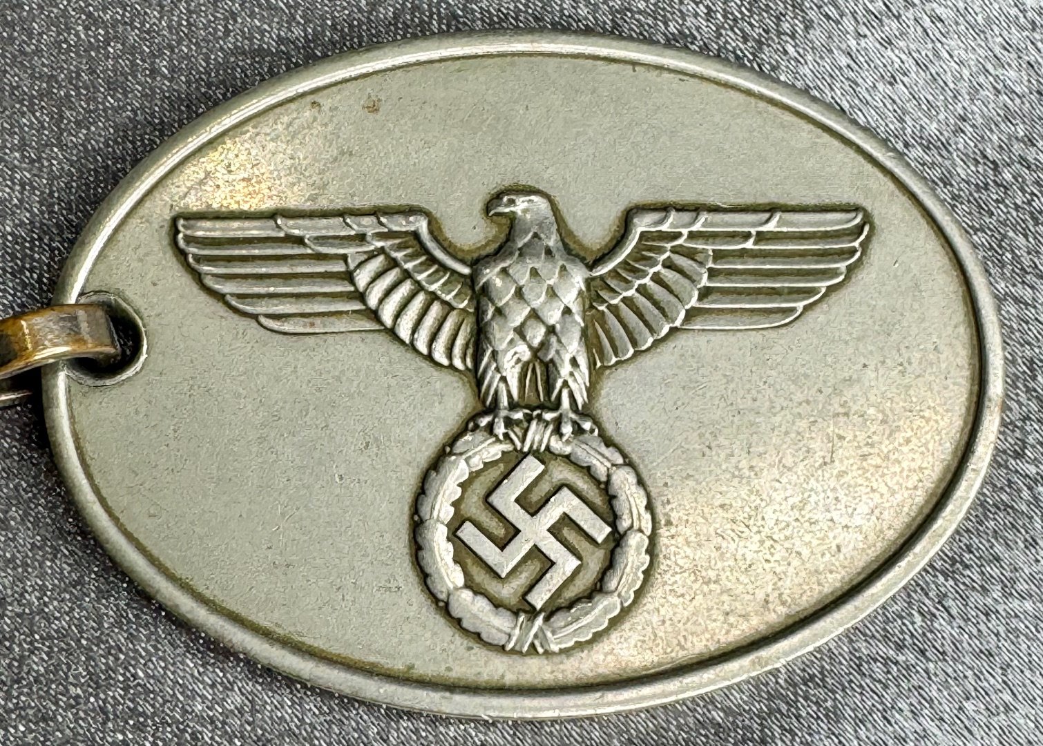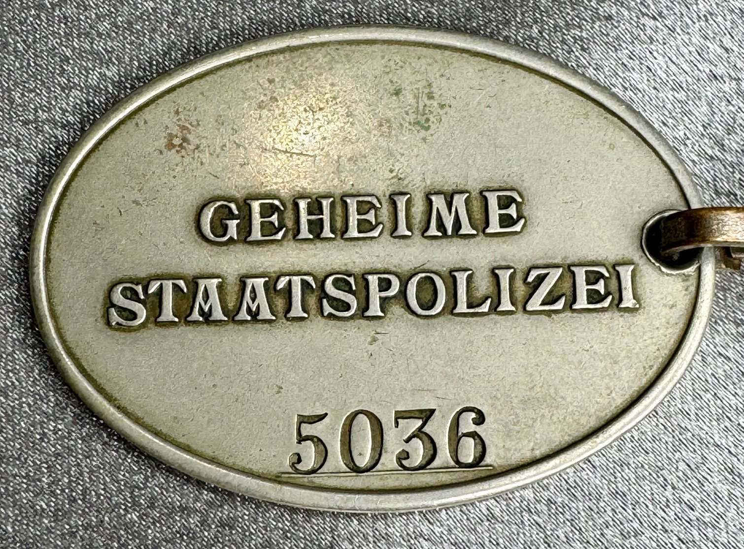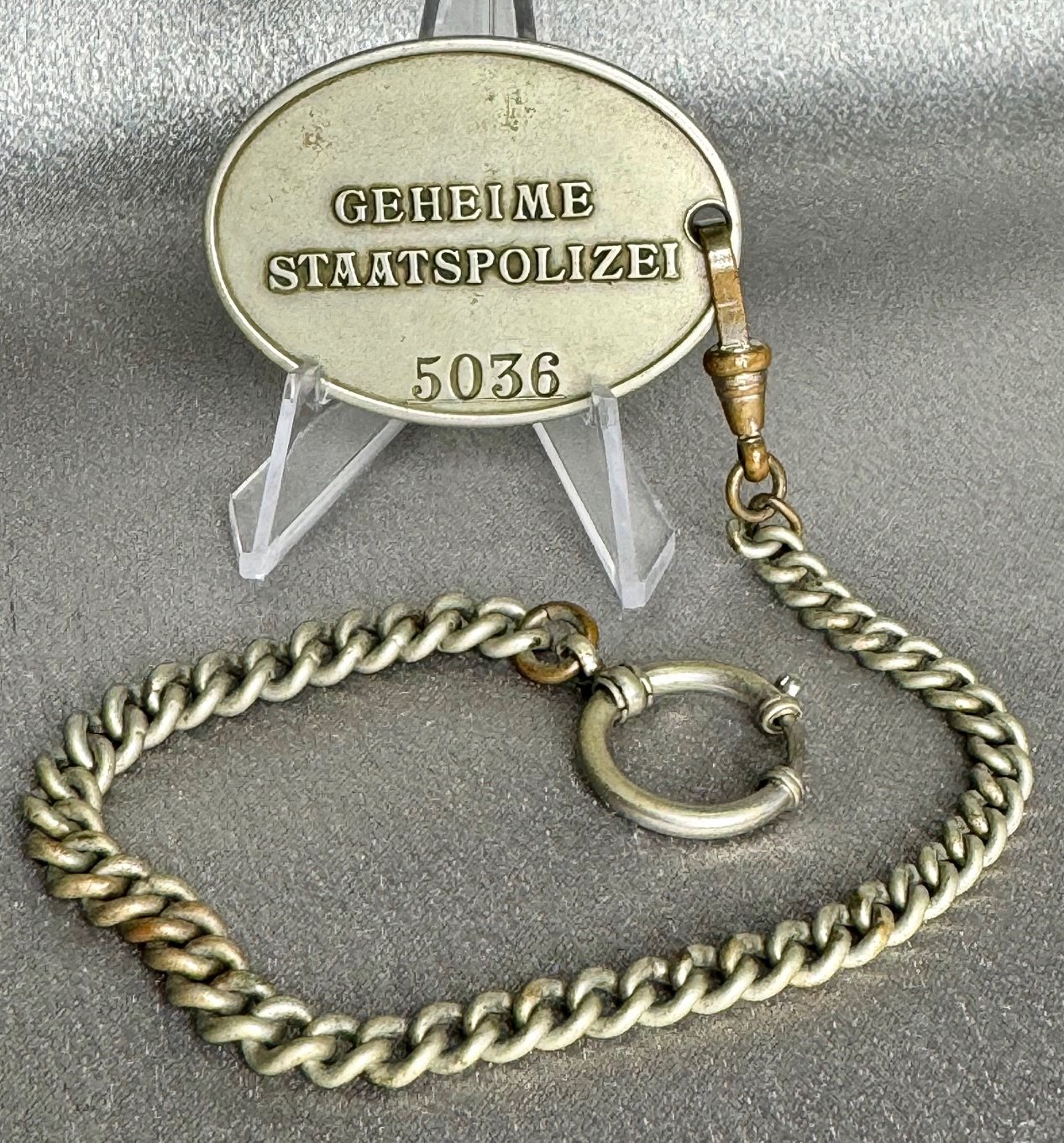 Secret State Police Warrant Disc number 5036 with original period chain. Excellent condition and very rare. This one listed in the Don Bible book on Warrant Discs as original, publishing by Schiffer Publishing in 2001.
