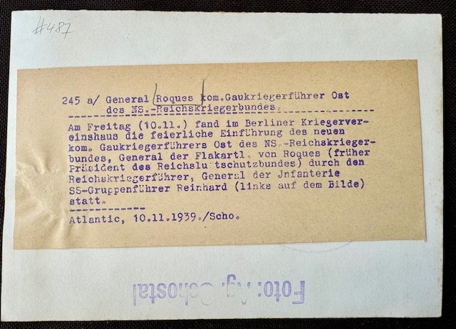 General Franz von Roques, commander of Gaukriegerführer Ost of the NS Reichskriegerbund, period press photo, approx. 7" X 5"