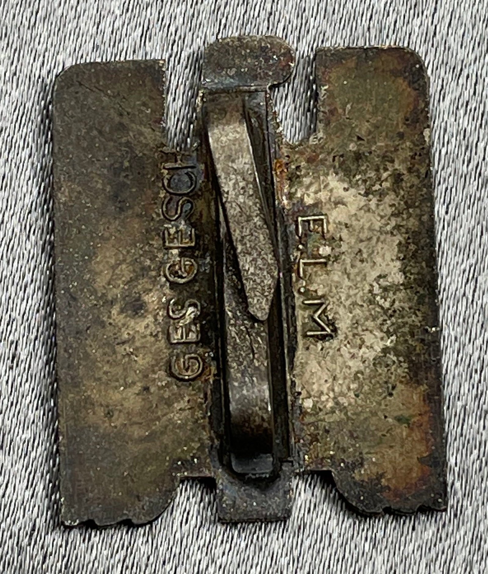 German Red Cross Membership Cap Badge, silver plated with black and red enamels size approx. 16 x 20mm, soldered working clasp pins and marked E.L.M (for maker Ernst L. Muller), Ges Gesch