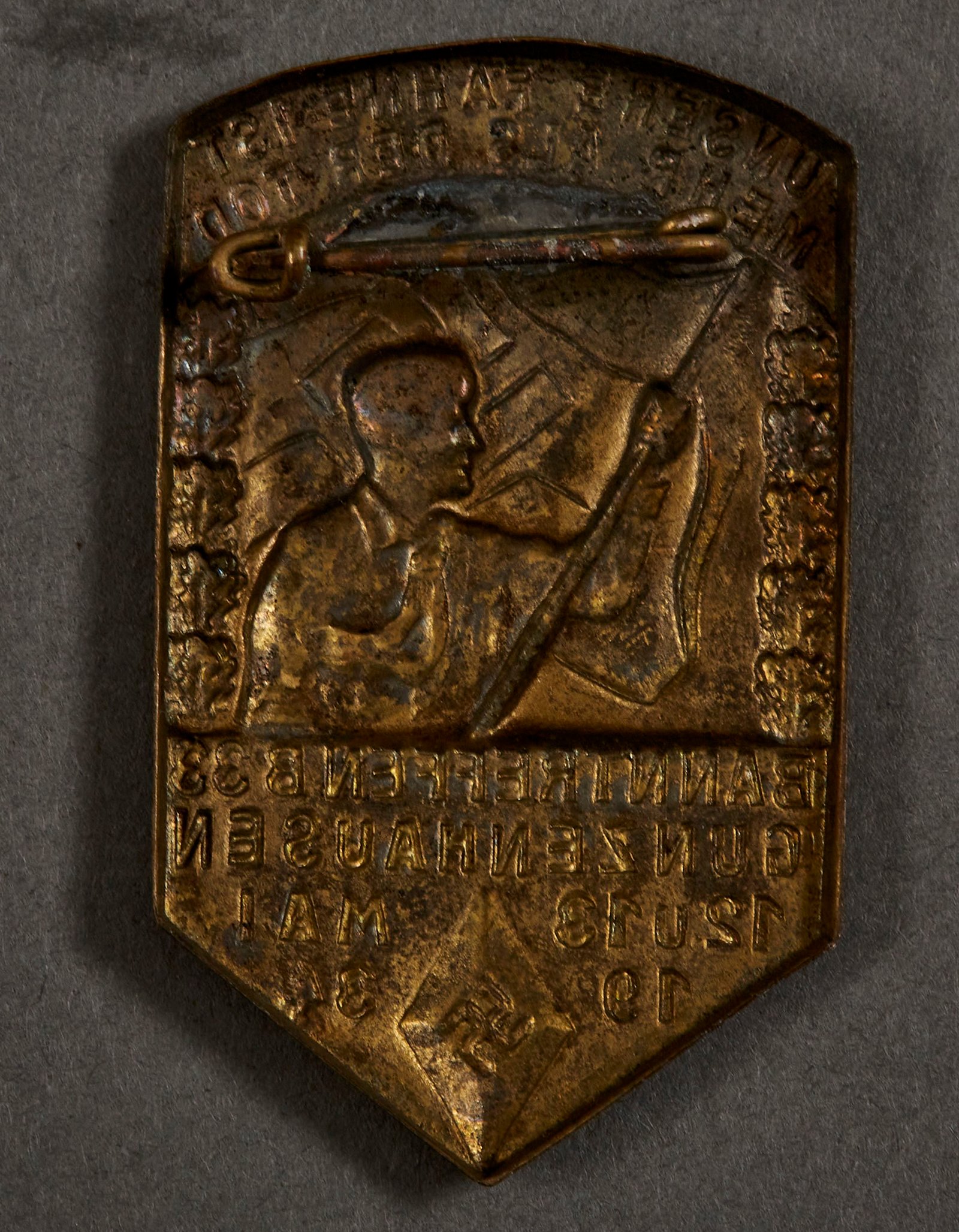 Banntreffen B33 Gunzenhausen 12. u. 13. Mai 1934 Unsere Fahne ist mehr als der Tod Tinnie, metal, 31mm X 51mm