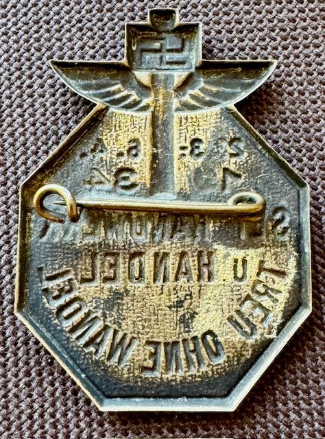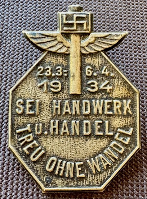 23. 3.-6. 4. 1934 Sei Handwerk u. Handel treu ohne Wandel Tinnie. Metal pinback.