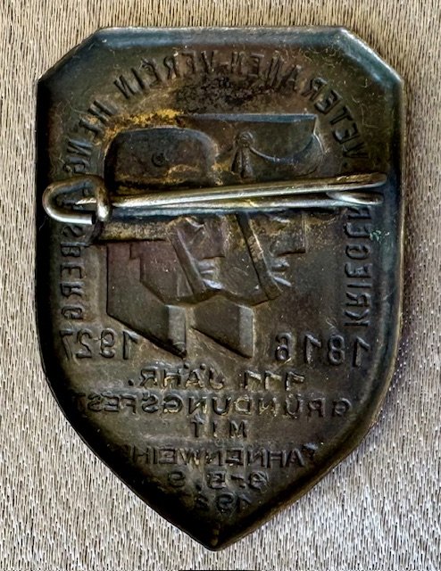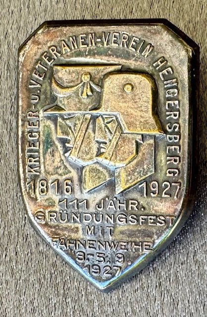 "Krieger-u. Veteranen-Verein Hengersberg 1816 1927 111 jähr. Gründungsfest mit Fahnenweihe 3.-5. 9. 1927", metal pinback, 27mm x 37mm