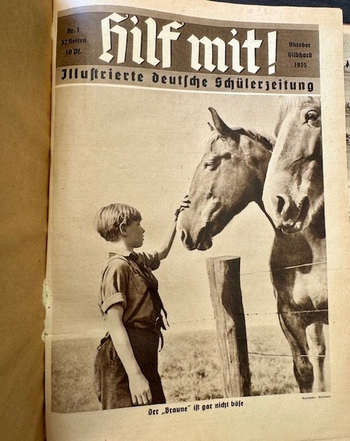Hilf mit! Illustrierte Schülerzeitung was the most important National Socialist newspaper for pupils in the Third Reich. It was not a paper by pupils for pupils but published by the Nationalsozialistischer Lehrerbund (NSLB or National Socialist Teachers Organization) and had educational and propagandistic content. Hard cover, all issues for 1935 and 1936.