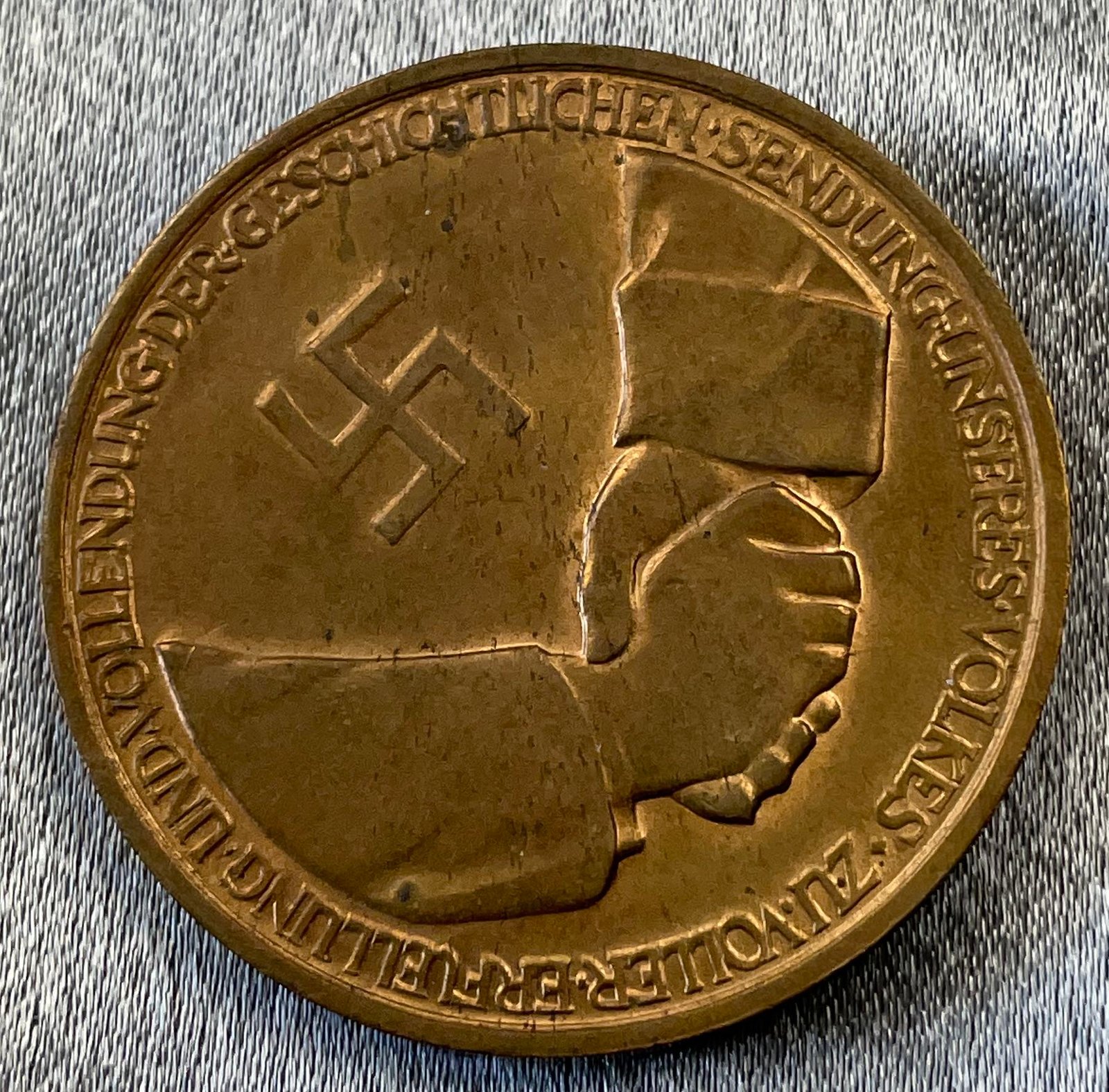 Front of medallion shows Hindenburg surrounded by the words. "GROSSER FELDHERR ZIEHE EIN IN WALHALL". Reverse shows shaking hands with swastika and the words, "Zu voller Erfüllung und Vollendung der geschichtlichen Sendung unseres Volkes". Gilt medal, 36mm with side struck, "Bayr. Hauptmünzamt".