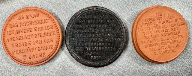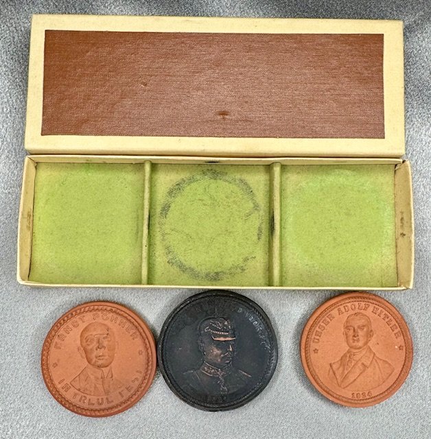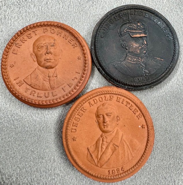 These 3 tokens were produced right after the Putsch in 1924, while Hitler was still in prison. They are made out of terra cotta clay in the likeness of Ernst Pöhner, Ludendorff, and Hitler. Each one is approx. 40mm (Hitler), 42mm (Ludendorrf), 41mm (Pöhner) , the size variance probably due to clay shrinkage. The reverse of Hitler reads, "Ich/Fuhle Mich Als/Bester Deutscher, Der/Das Beste Fur Das Deutsche/Volk Gewollt hat./Tausend Nationale/Haben Das Recht, Einer/Mehrheit Gegenuber,/Die Nation Zu/Vertreten." (I feel that I am the best German who wants the best for the German People. A thousand patriot have the right of the majority to represent the Nation." Pöhner was a central figure in the putsch and was to be named Bavaria's minister president if the coup succeeded. Very rare, only the 2nd one I have seen