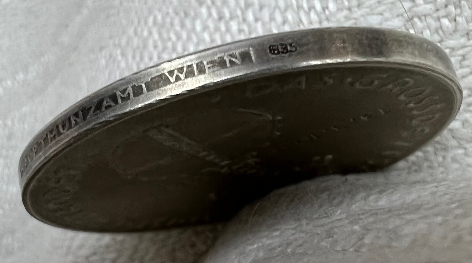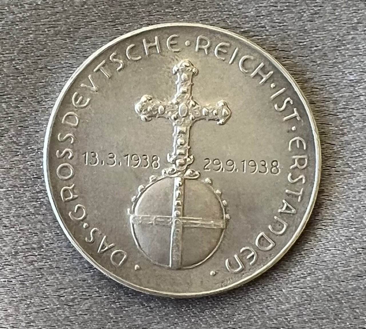 Bust of Hitler facing right with the surrounding inscription, "DER EINER UND FÜHRER ALLER DEUTSCHEN" (The one and only leader of all Germans). Below the bust is the artist signature, "Hanisch Concee". Reverse has orb and cross with incused dates, "13.3.1938" and "29.9.1938"' on either side. The surrounding inscription reads, "DAS GROSSDEUTSCHE REICH IST ERSTANDEN" (The Greater German Empire is Arisen). The artist's signature is found incused near the rim around the 4-5 0'clock position. The bottom side is stamped, "HAUPTMÜNZAMT WIEN 835". Struck in silver, 36mm. C-114 in the Colbert-Hyder book.