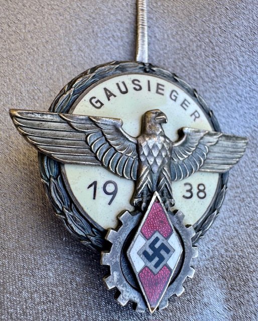 Hitler Youth 1938 Gausieger Badge for National Trade Competition (Reichsberufswettkampf), maker marked "G. Brehmer Markneukirchen", excellent condition.