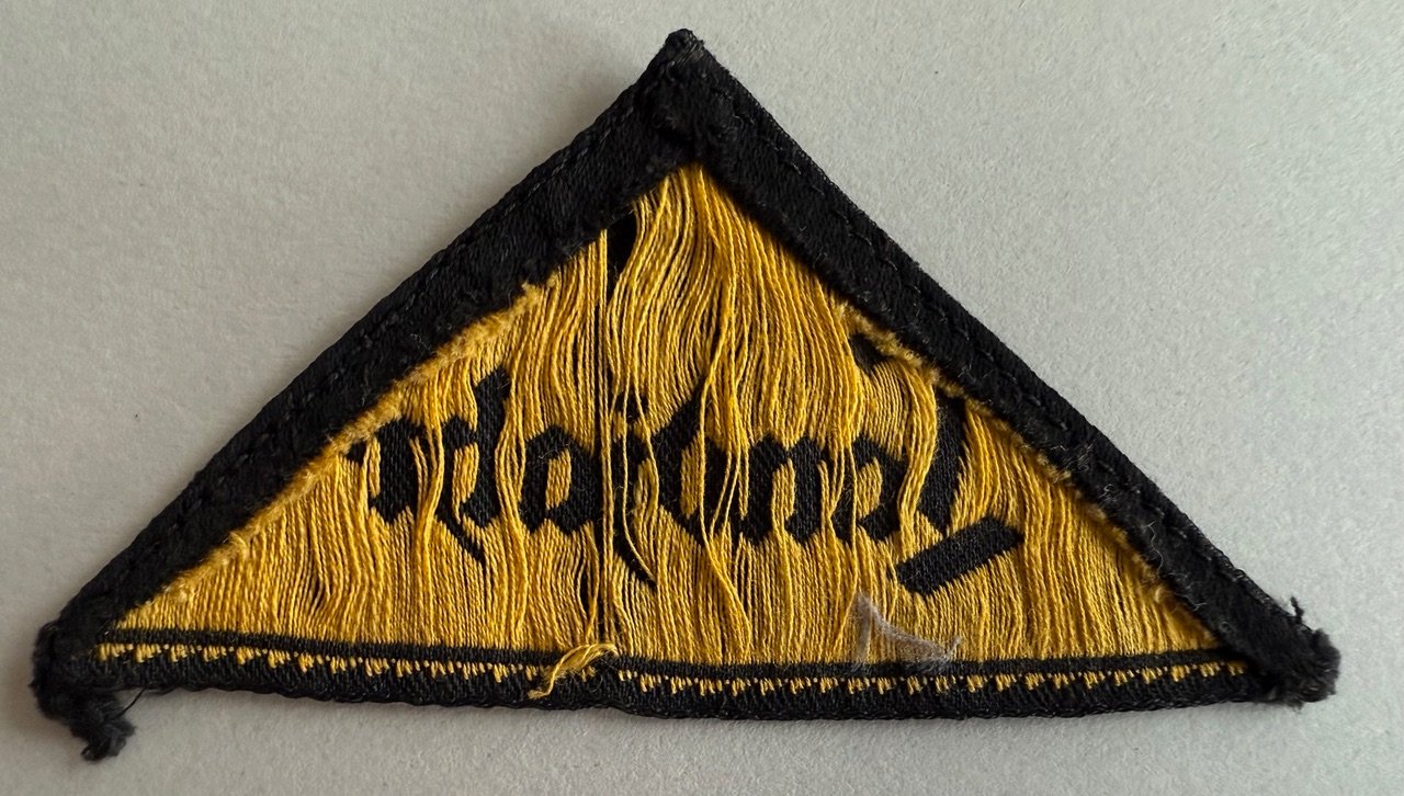 1st version Landjahr sleeve triangle for the HJ, as seen in the Wilhelm Saris book 'Handbook of the Hitler Jugend' (pages 475-476). As Saris explains, the black variation was only in use for 3-4 weeks in the spring of 1934 before being phased out and replaced by the much more common green version, which would explain why these first versions are so impossible to find. This earlier model was available for both the HJ (gold font on a black background) as well as for the BDM (white font on a black background), while the later green version with white letters was used by both the HJ and BDM. Very rare to find