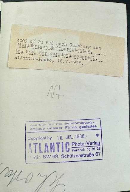 Hitler Youth Photo, press photo. "On foot to Nuremberg for this year's Nazi Party Rally 16.7.1938", approx. 5" X 7"
