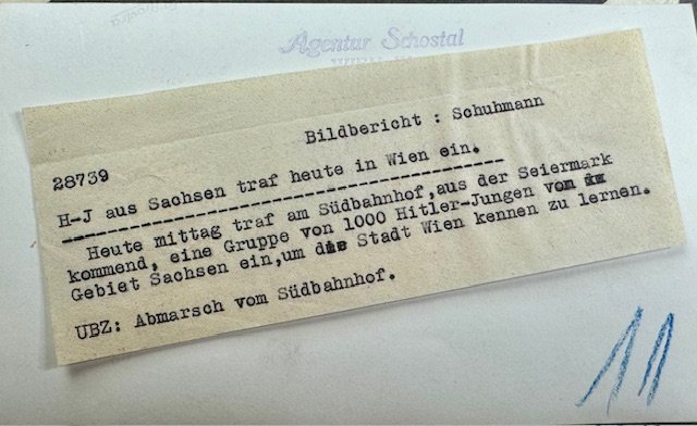 Hitler Youth Photo, press photo. "HJ from Saxony arrived in Vienna today. Today at noon a group of 1000 HJ from the Saxony region arrived at the South Station, coming from Seiermark, to get to know the city of Vienna.", approx. 7" X 5"