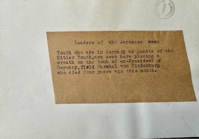 Hitler Youth with Japanese leaders laying wreath at von Hindenburg's grave in 1938. Press photo, approx. 7" X 5" in size