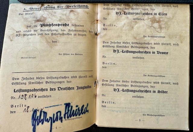 Hitlerjugend Leistungsbuch, complete, moisture damage
