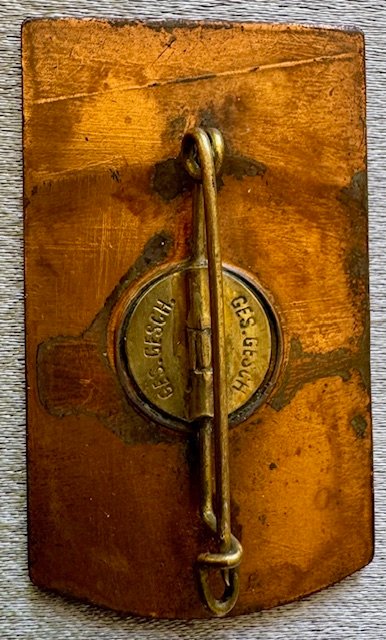 HJ 1. Franken Ostmark Treffen in Nürnberg 22-23.7.1933 tinnie, in bronze, vertical pinback, marked “Ges. Gesch.” on the reverse; measuring 26 mm x 44 mm, excellent