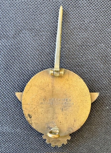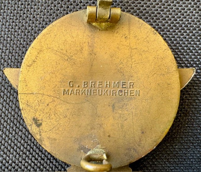 HJ Kreissieger badge, maker marked to reverse "G. BREHMER MARKNEUKIRCHEN". The badge displays the correct cream colored enameled background and details to the eagle and HJ diamond. Excellent condition.