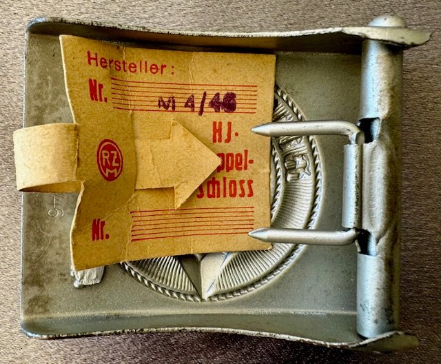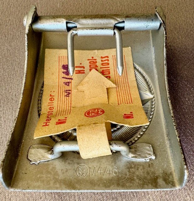 HJ Buckle, unissued with RZM tag. Aluminum injection mold buckle in excellent condition and is marked RZM M4/46 for Wilhelm Schröder of Lüdenscheid. Very uncommon Hitler youth buckle.