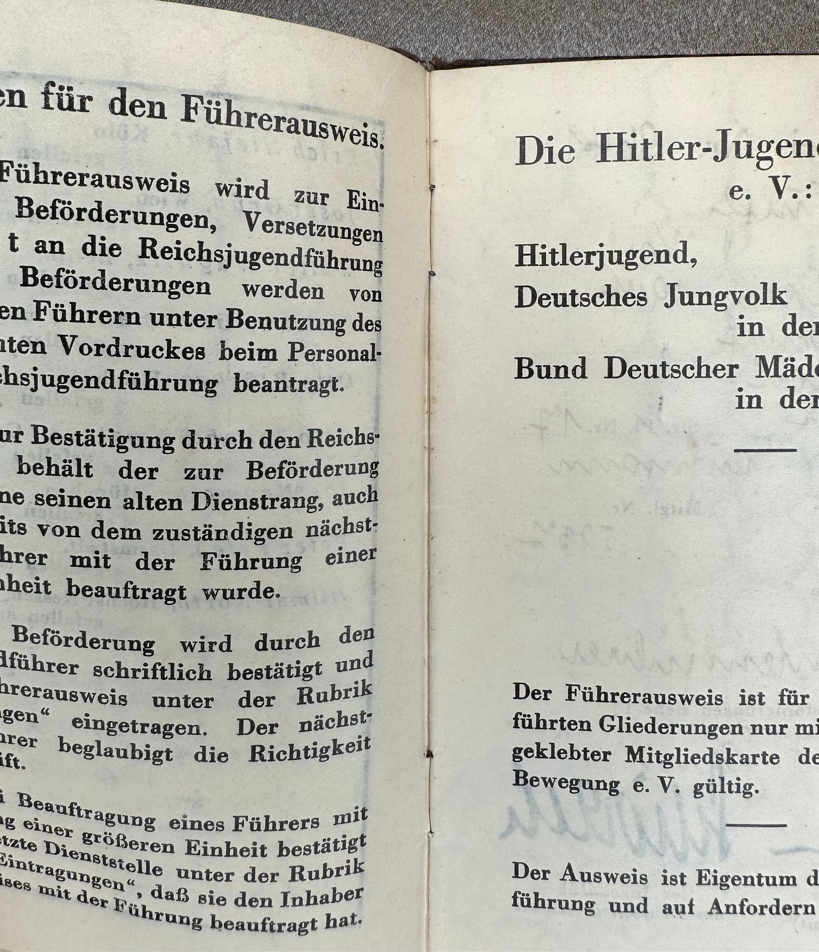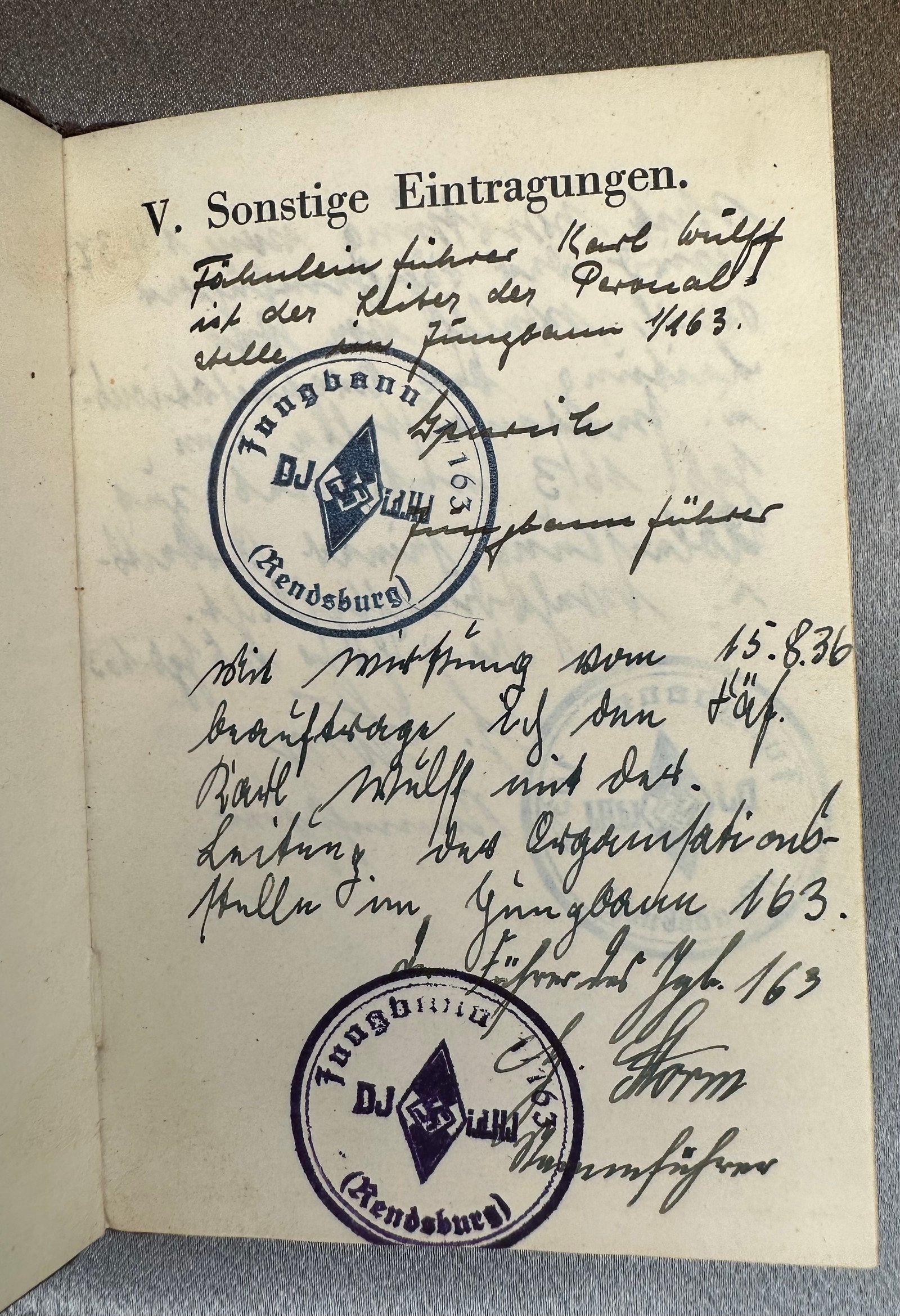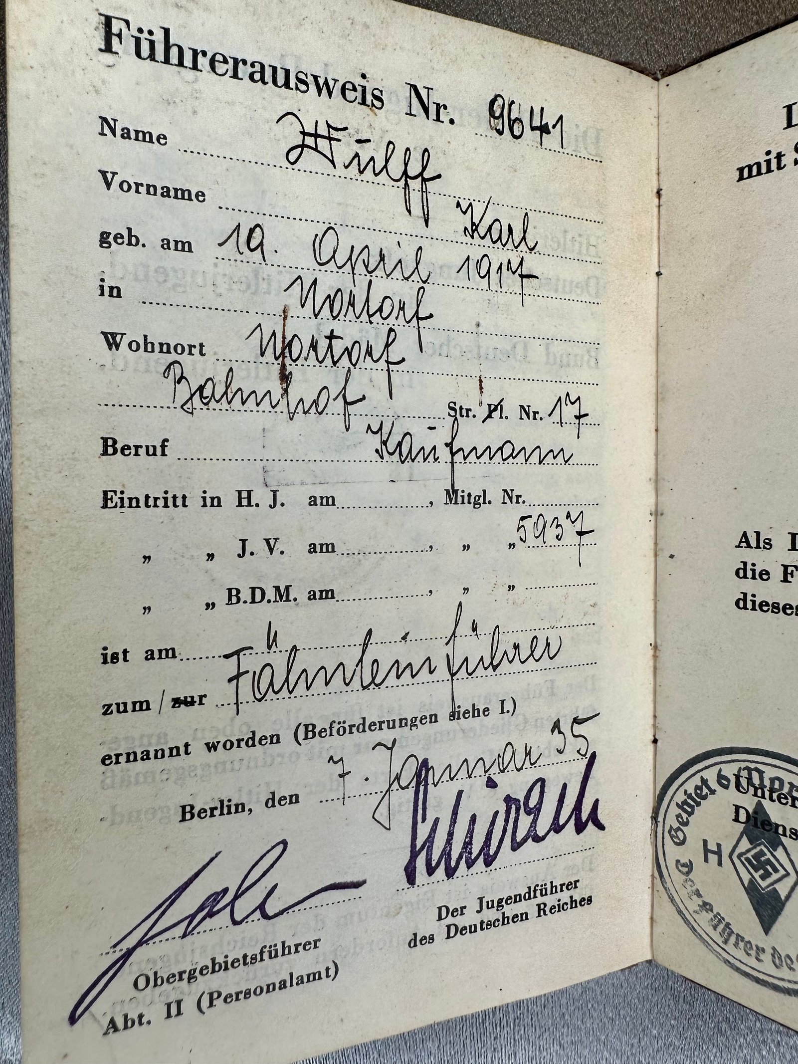 HJ Führerausweis. Lichtbild des Ausweisinhabers mit Stempel der Reichsjugendführung. Hardstock booklet with several entries issued in 1935. Complete and intact
