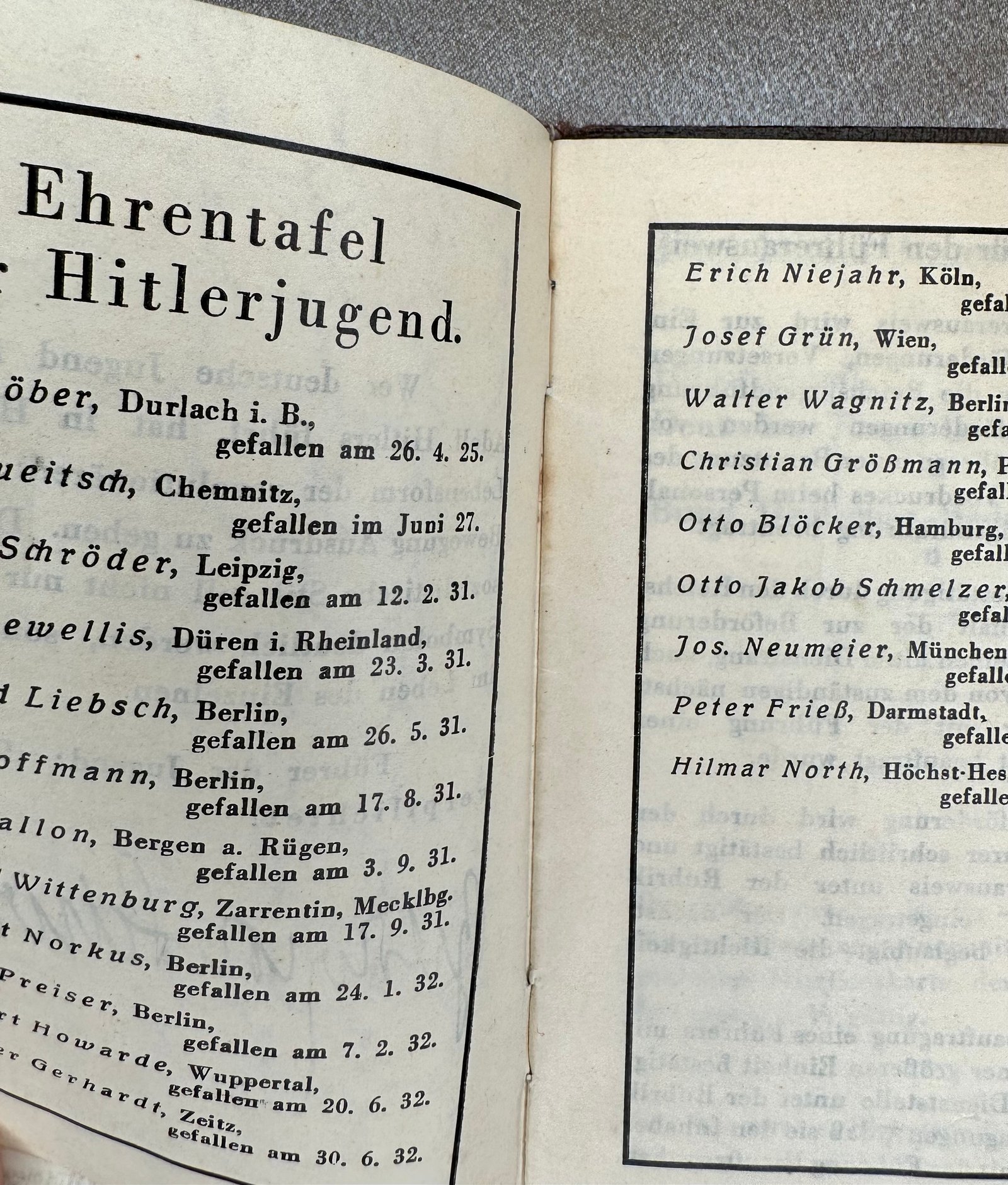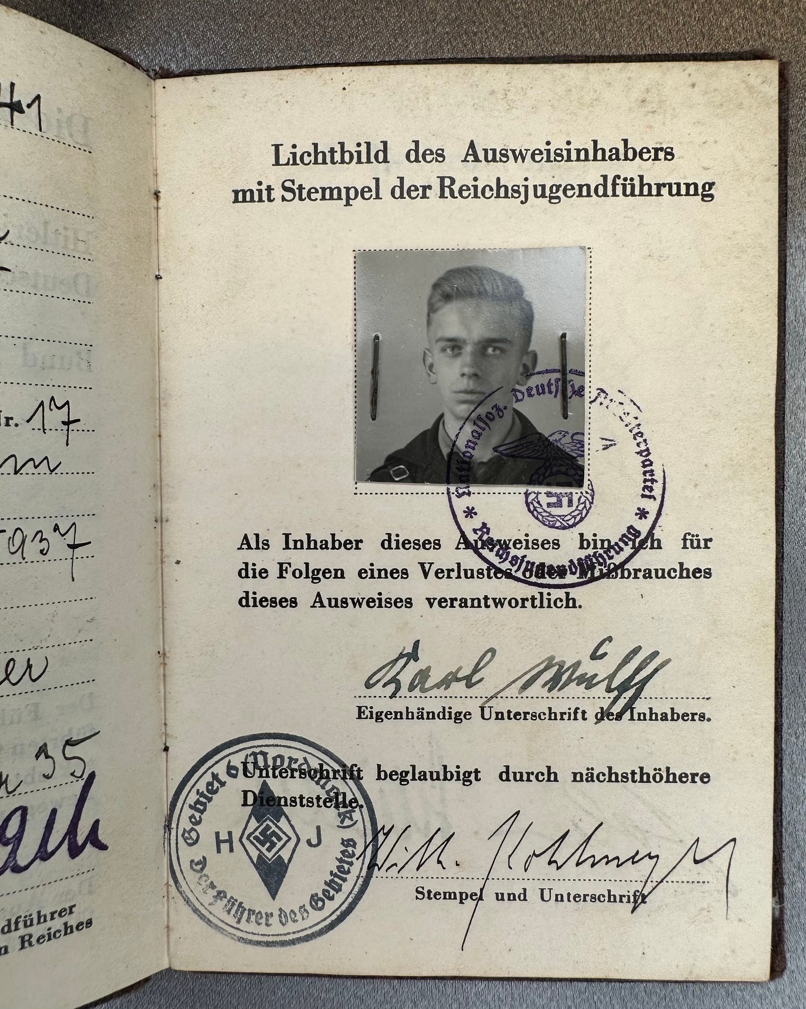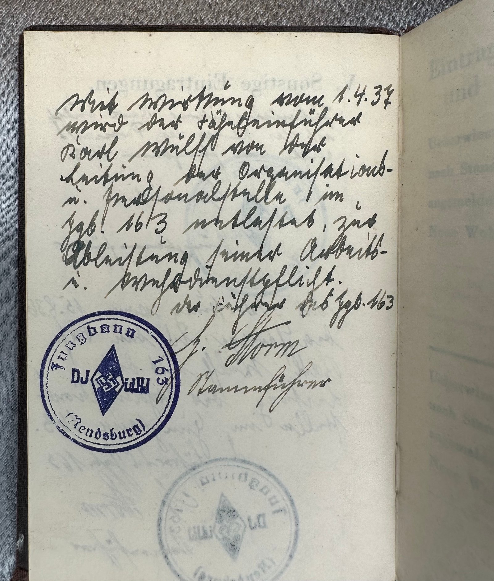 HJ Führerausweis. Lichtbild des Ausweisinhabers mit Stempel der Reichsjugendführung. Hardstock booklet with several entries issued in 1935. Complete and intact