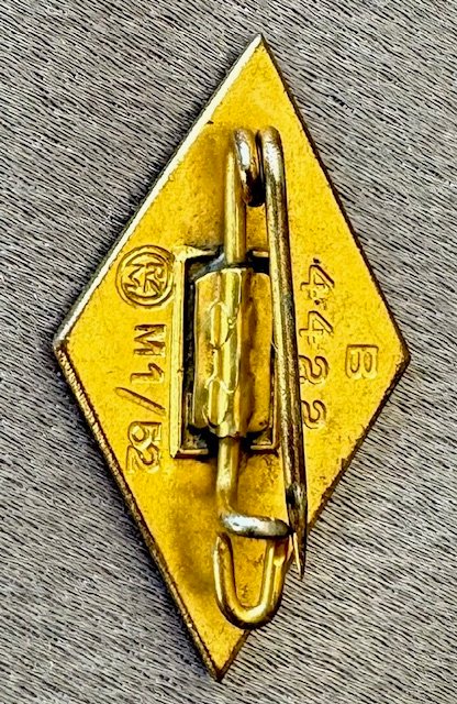 Goldenes HJ-Ehrenzeichen. Instituted August 1934 by Baldur von Schirach. (1934-1943 issue). Constructed of gilded bronze with multi-coloured enamels, the obverse bearing an HJ insignia within a gilt border, the reverse with a vertical pinback, stamped with an issue number of “B4422” and marked with a Reichszeugmeisterei (RZM) logo and maker code “M1/52” for Deschler & Sohn, Munich, measuring 17.19 mm (w) x 29.46 mm (h)