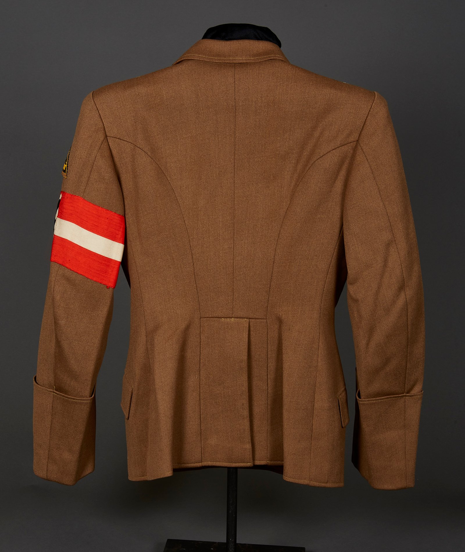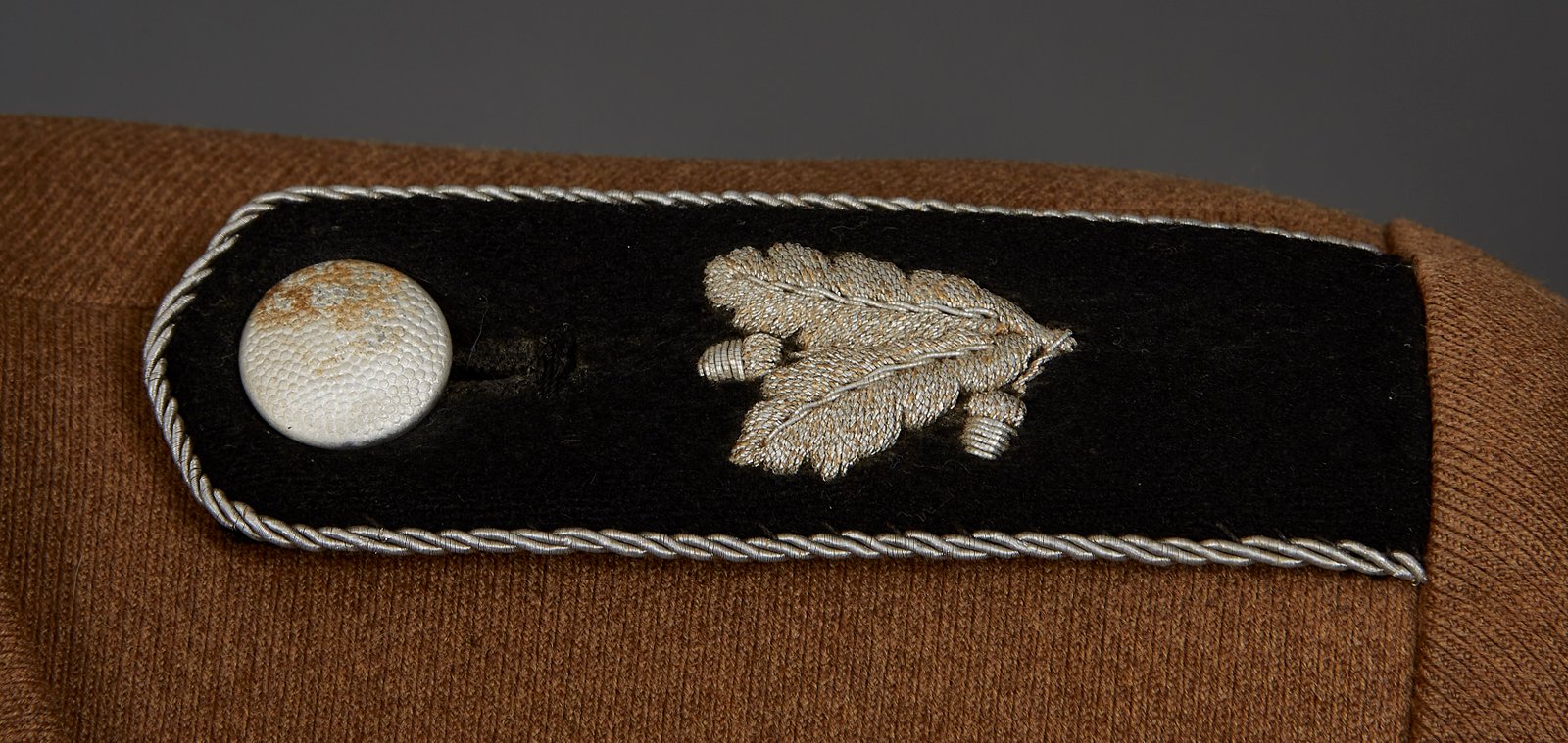 HJ Oberbannführer Service Tunic for West Ruhr-Niederrhein area. This tunic features slash pockets and numerous medal loops to both breast pockets as shown, along with tradition stripe to triangle indicating service prior to 1933. Excellent condition !