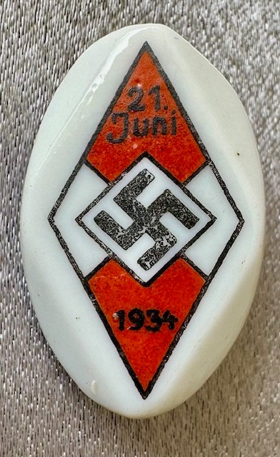 HJ Sports Award Badge given to participants in the National Sports contest on 21 Juni 1934. Porcelain pin back, marked "15" to reverse, 18mm x 28mm