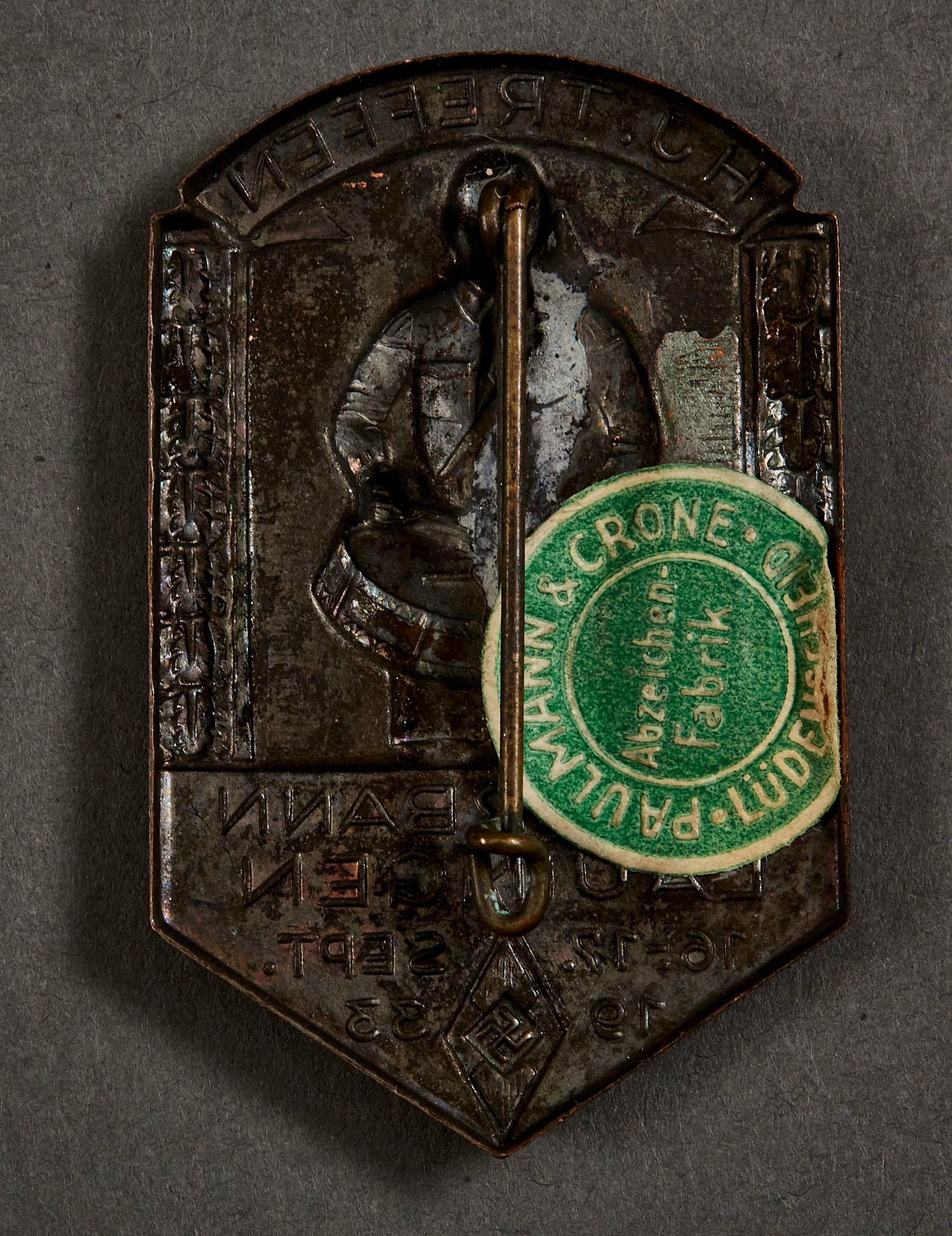 HJ Treffen Unterbann Lauingen 16.-17. Sept 1933 Tinnie, metal, paper maker marked, 30mm x 48mm