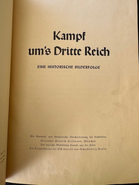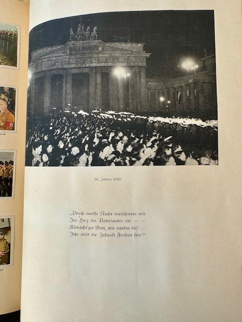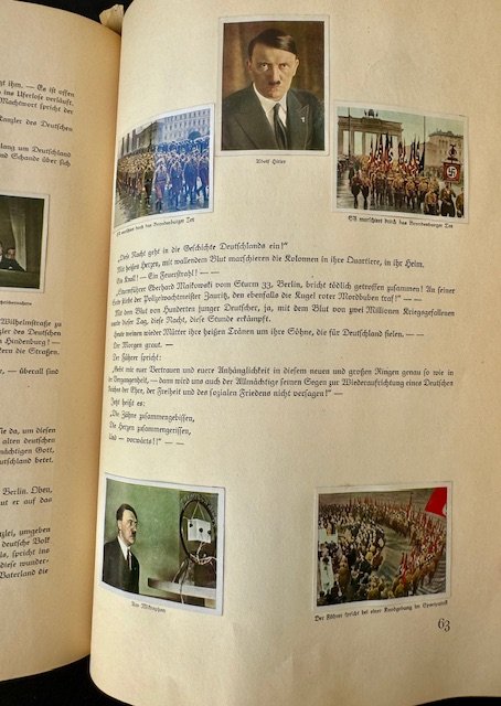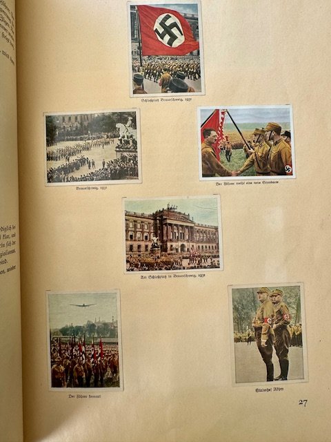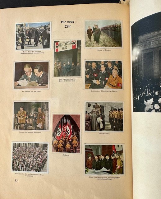 Kampf um's Dritte Reich. Printed in Germany in 1933 by Cigaretten-Bilderdienst Altona-Bahrenfeld. This book is full of small colorful photos illustrating the story of Hitler and the NSDAP party and all its subsidiary organizations like RAD, Hitler Youth, and many others. There are 92 pages in total.