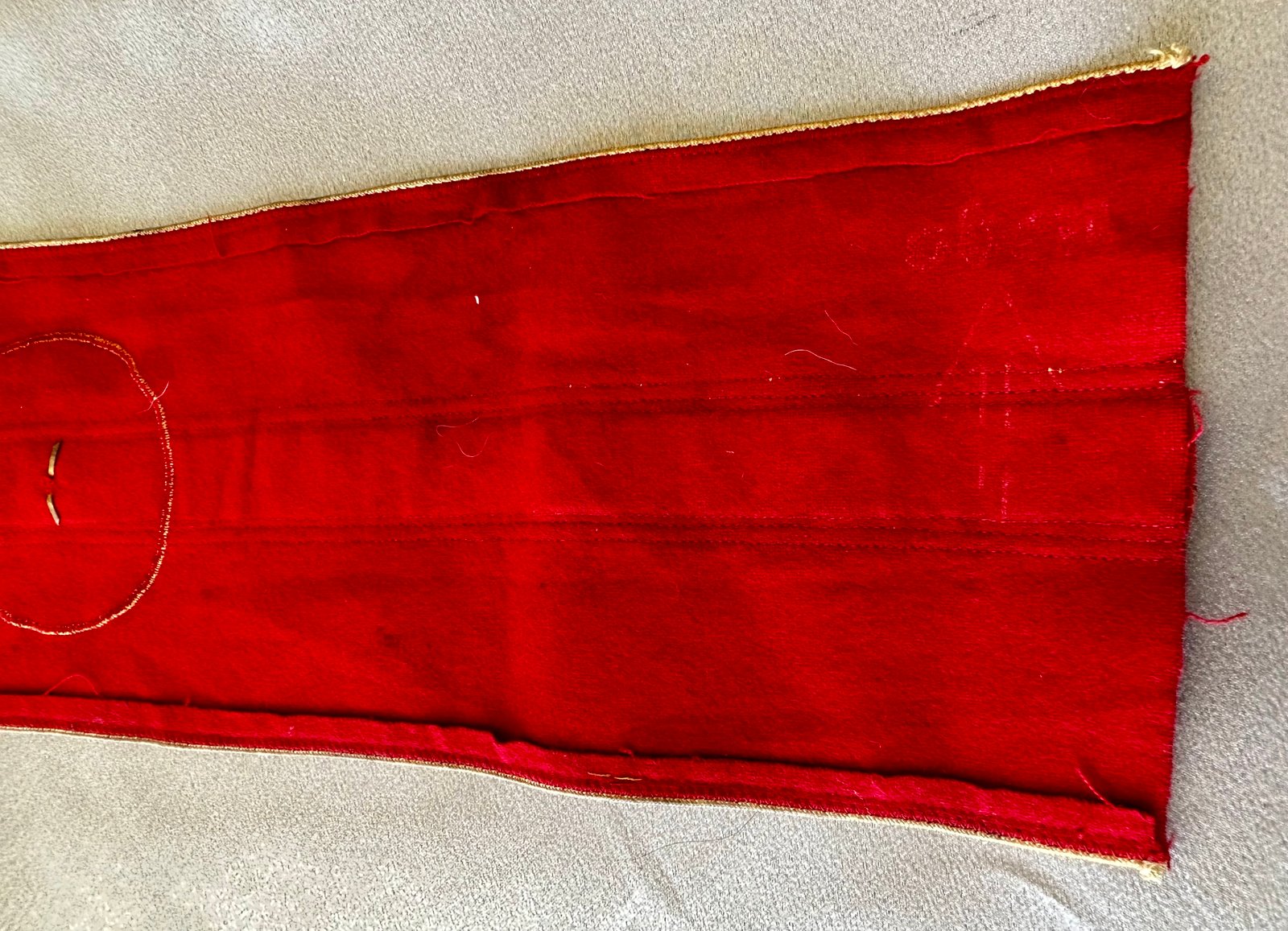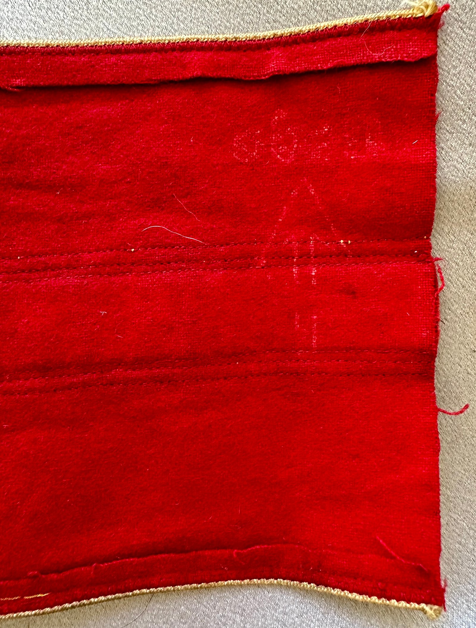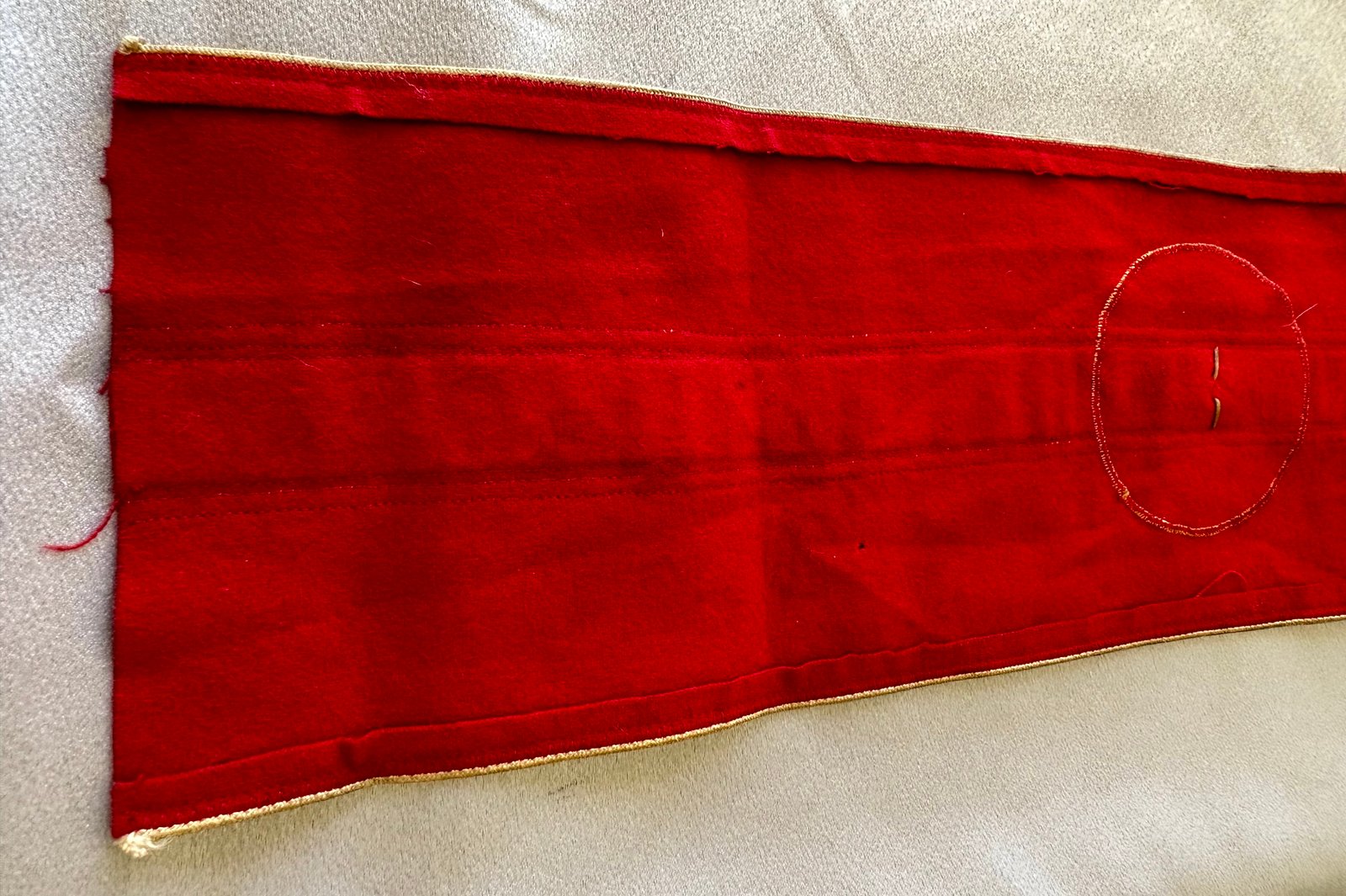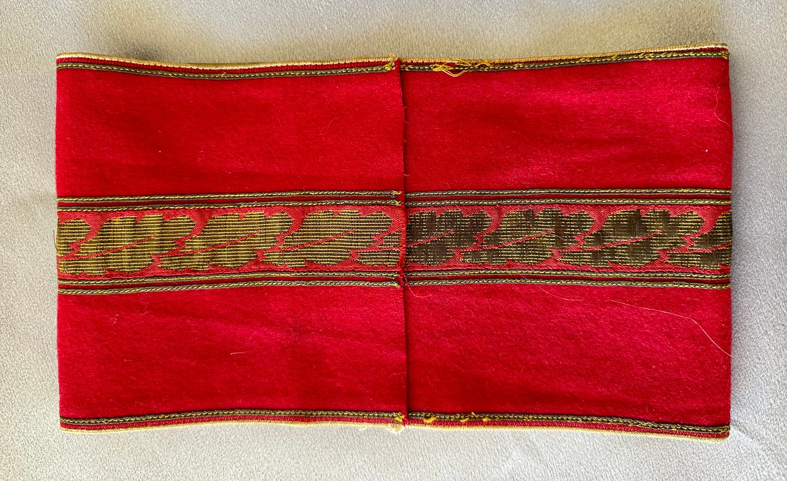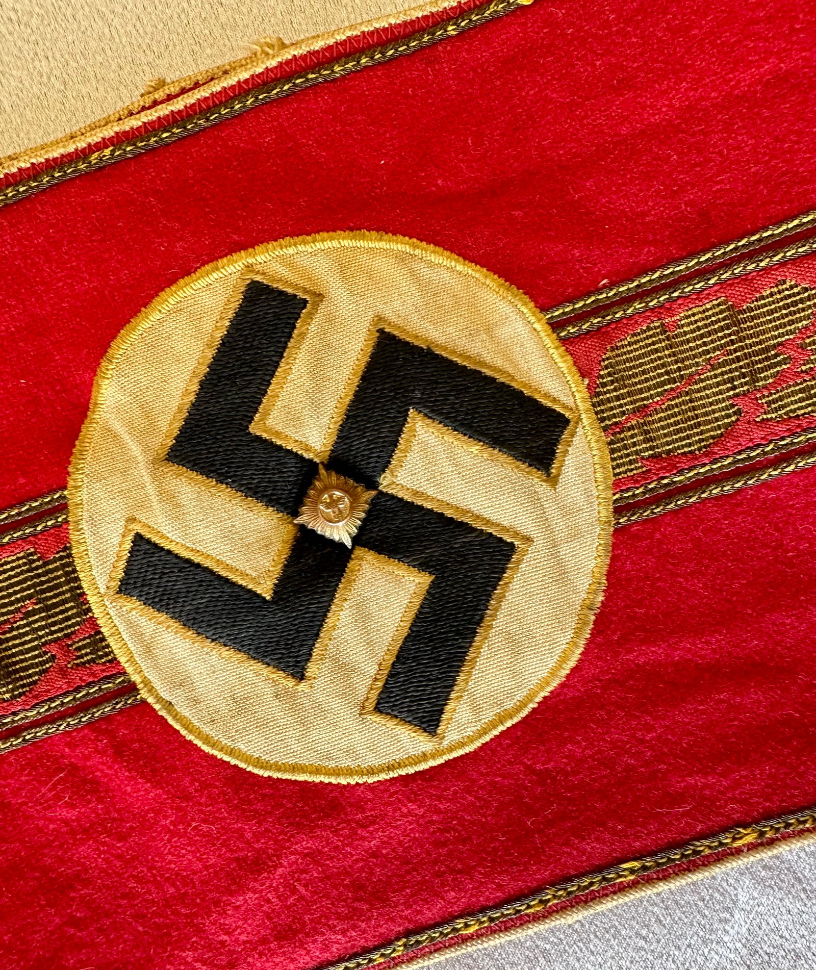 Armband for NSDAP Kreisleiter. Gold bullion oakleaves with black bevo swastika and pip in the center. This one came off a tunic and has some honest aging to it, white "oben" arrow stamp, approx. 20" in length. Overall very nice condition.