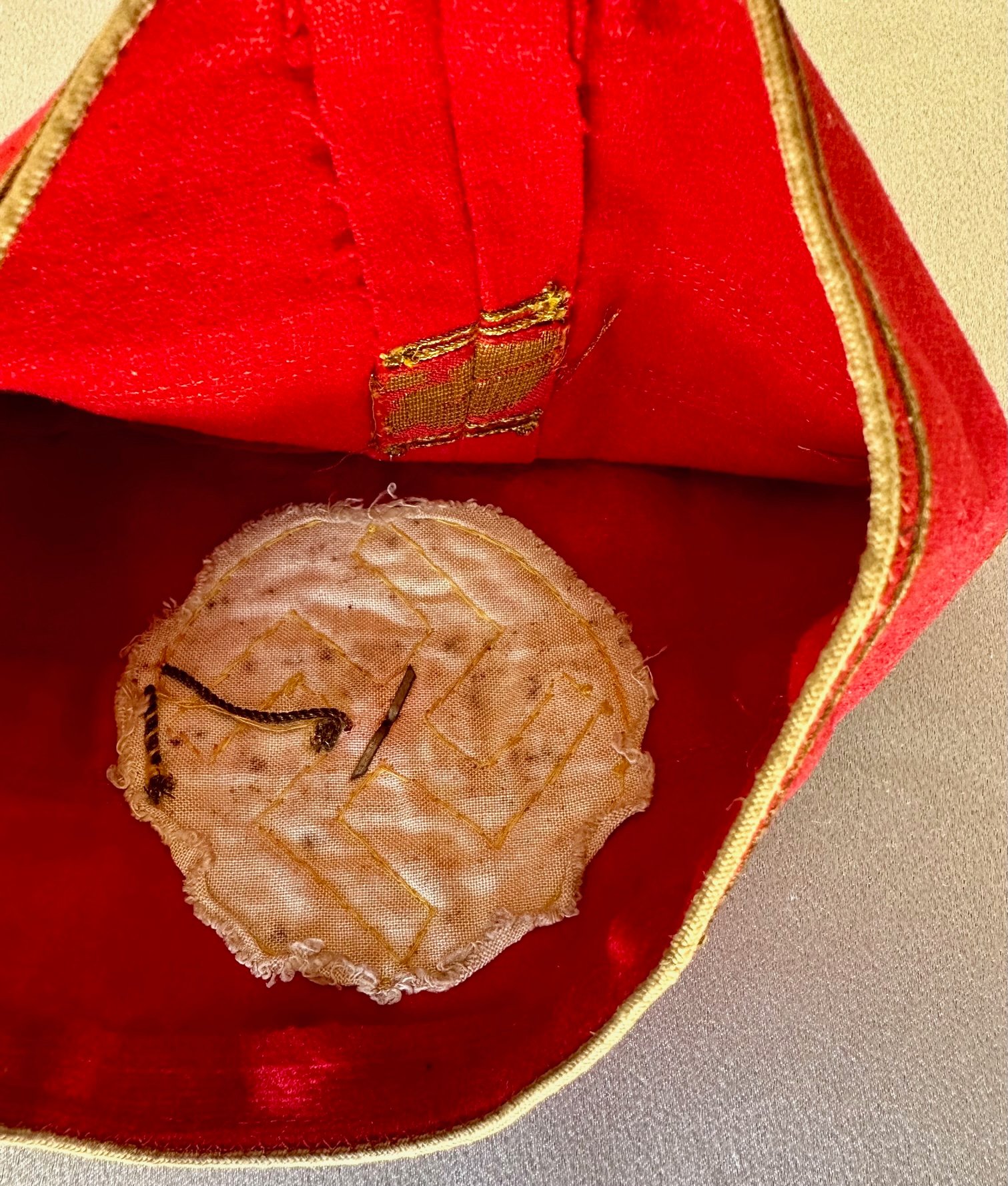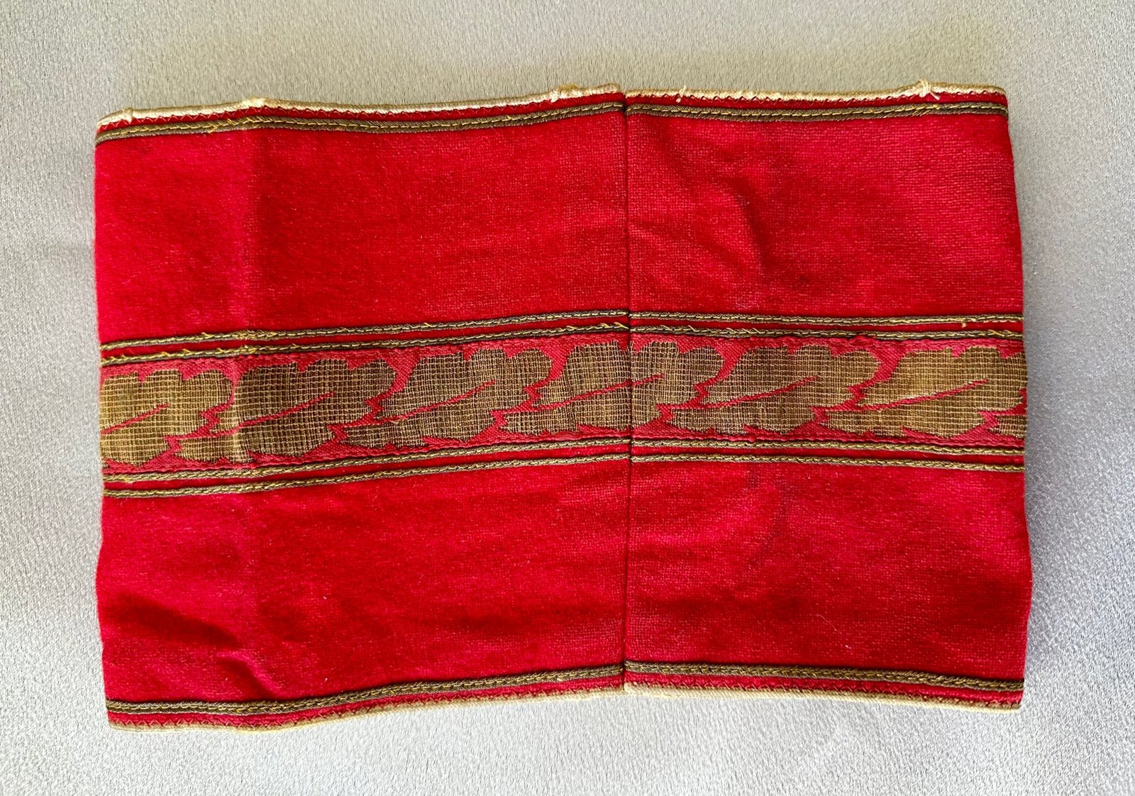 Armband for NSDAP Kreisleiter. Gold bullion oakleaves with black ribbon swastika and pip in the center. This one came off a tunic, sewn together, approx. 20" in length. Overall very nice condition.
