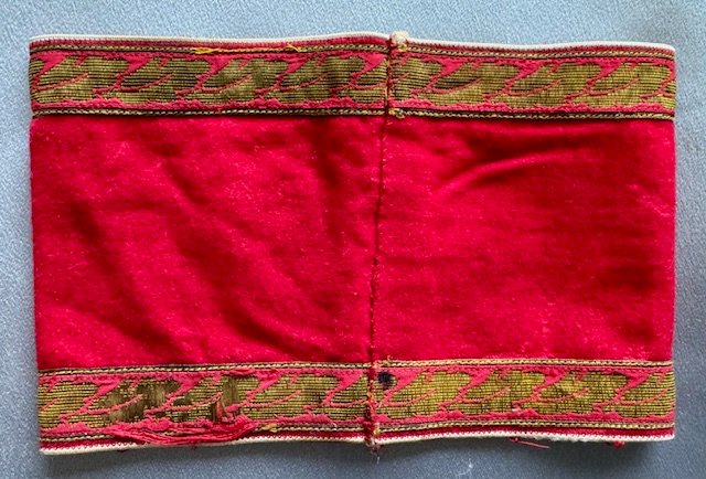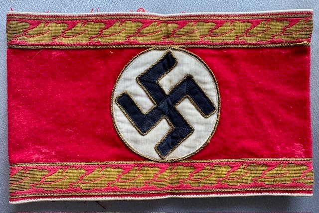 Armband for Kreis Level Leiter eines Hauptamtes. Bullion oakleafs with black ribbon swastika. This armband was on a tunic at one time, sewn together, approx. 18" in length
