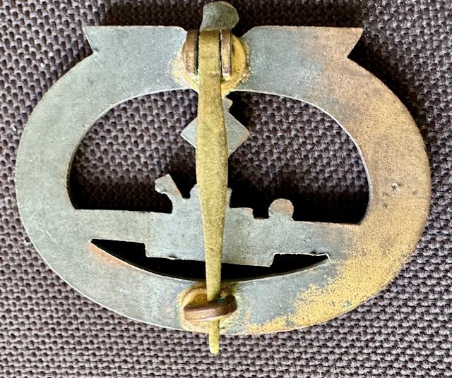 Kriegsmarine U-Boat Badge, French Made. This piece is in excellent condition for its age. All French made German Navy badges utilized the same hinge, catch and pin assemblies. These badges are all die forged and all are zinc based with this example having crisp details and a good look.