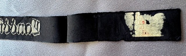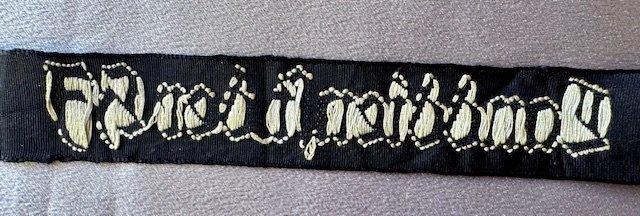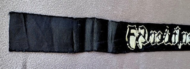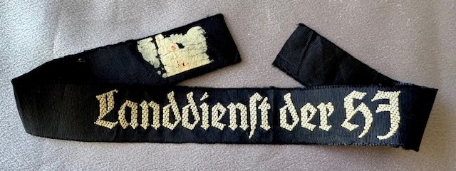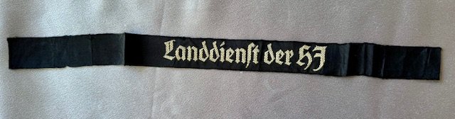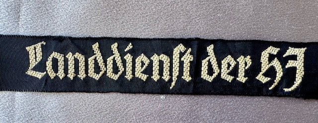 Landdienst der HJ Cuff Title (Land service of the HJ), constructed of a black cotton base, the obverse bearing the white embroidered inscription, remnants of RZM tag, 14" in length
