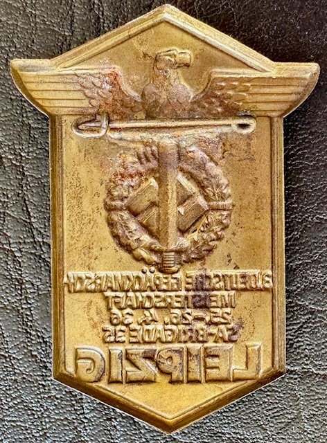 "3. Deutsche Gepäckmarsch Meisterschaft badge 25-26.4.1936 SA Brigade 35 Leipzig", in bronzed metal, horizontal pinback; unmarked, measuring 63 mm x 45 mm; very fine condition.