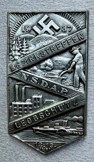 Leobschütz Tinnie, "Bezirkstreffen N.S.D.A.P. Leobschütz 12-13. Juni", metal pinback, uncommon
