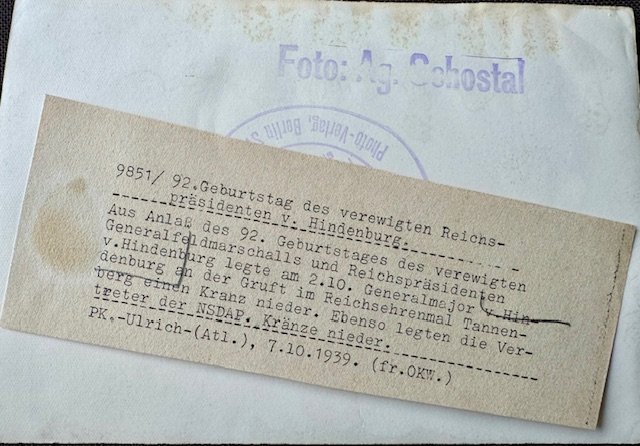 92nd birthday of the immortalized Reich President von Hindenburg. Major General von Hindenburg laid a wreath at the crypt in the Reich Memorial Tannenberg on October 7, 1939. Period press photo, approx. 7" X 5"
